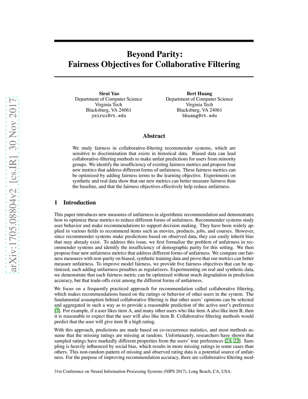 We study fairness in collaborative-filtering recommender systems, which are sensitive to discrimination that exists in historical data. Biased data can lead collaborative-filtering methods to make unfair predictions for users from minority groups. We identify the insufficiency of existing fairness metrics and propose four new metrics that address different forms of unfairness. These fairness metrics can be optimized by adding fairness terms to the learning objective. Experiments on synthetic and real data show that our new metrics can better measure fairness than the baseline, and that the fairness objectives effectively help reduce unfairness.