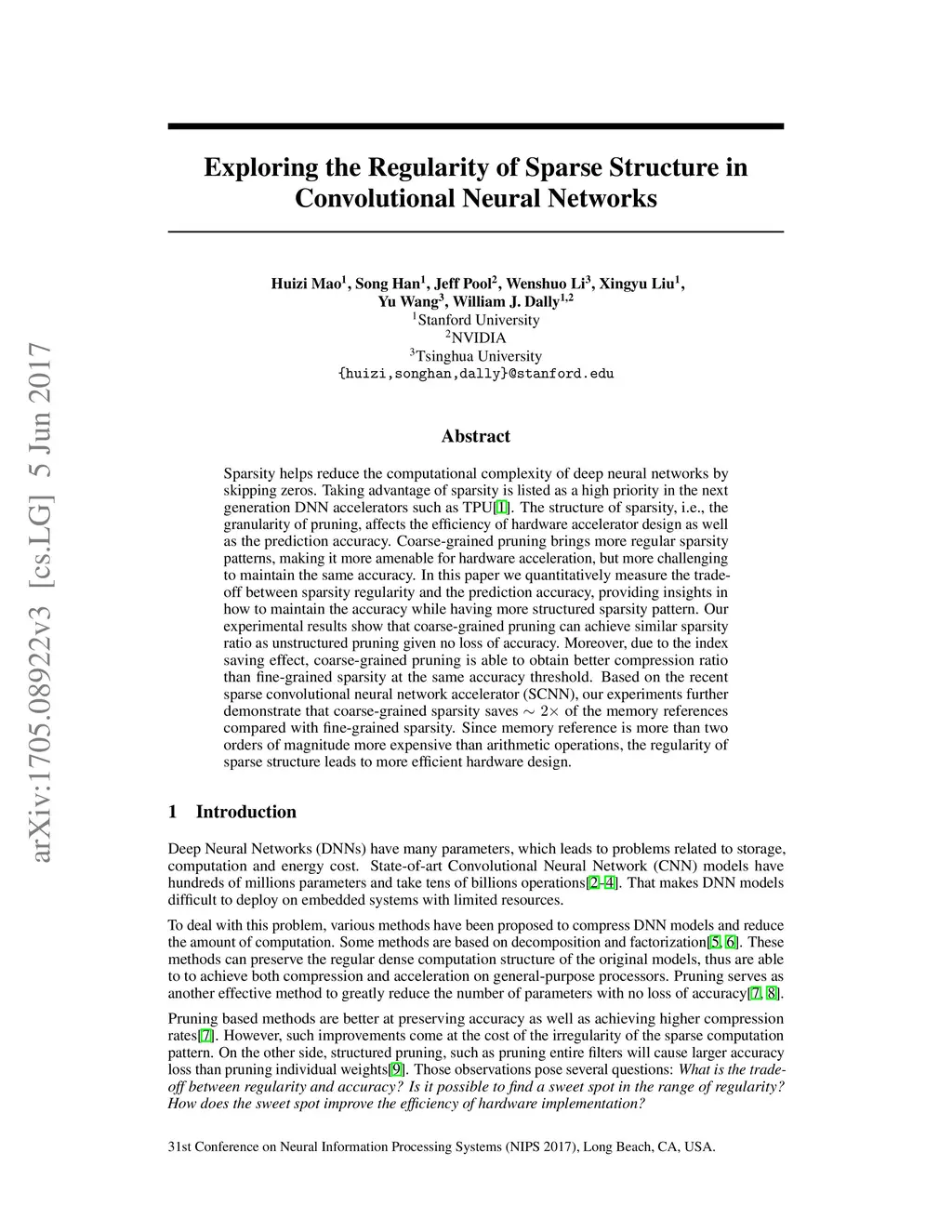 Sparsity helps reduce the computational complexity of deep neural networks by skipping zeros. Taking advantage of sparsity is listed as a high priority in next generation DNN accelerators such as TPU. The structure of sparsity, i.e., the granularity of pruning, affects the efficiency of hardware accelerator design as well as the prediction accuracy. Coarse-grained pruning creates regular sparsity patterns, making it more amenable for hardware acceleration but more challenging to maintain the same accuracy. In this paper we quantitatively measure the trade-off between sparsity regularity and prediction accuracy, providing insights in how to maintain accuracy while having more a more structured sparsity pattern. Our experimental results show that coarse-grained pruning can achieve a sparsity ratio similar to unstructured pruning without loss of accuracy. Moreover, due to the index saving effect, coarse-grained pruning is able to obtain a better compression ratio than fine-grained sparsity at the same accuracy threshold. Based on the recent sparse convolutional neural network accelerator (SCNN), our experiments further demonstrate that coarse-grained sparsity saves about 2x the memory references compared to fine-grained sparsity. Since memory reference is more than two orders of magnitude more expensive than arithmetic operations, the regularity of sparse structure leads to more efficient hardware design.