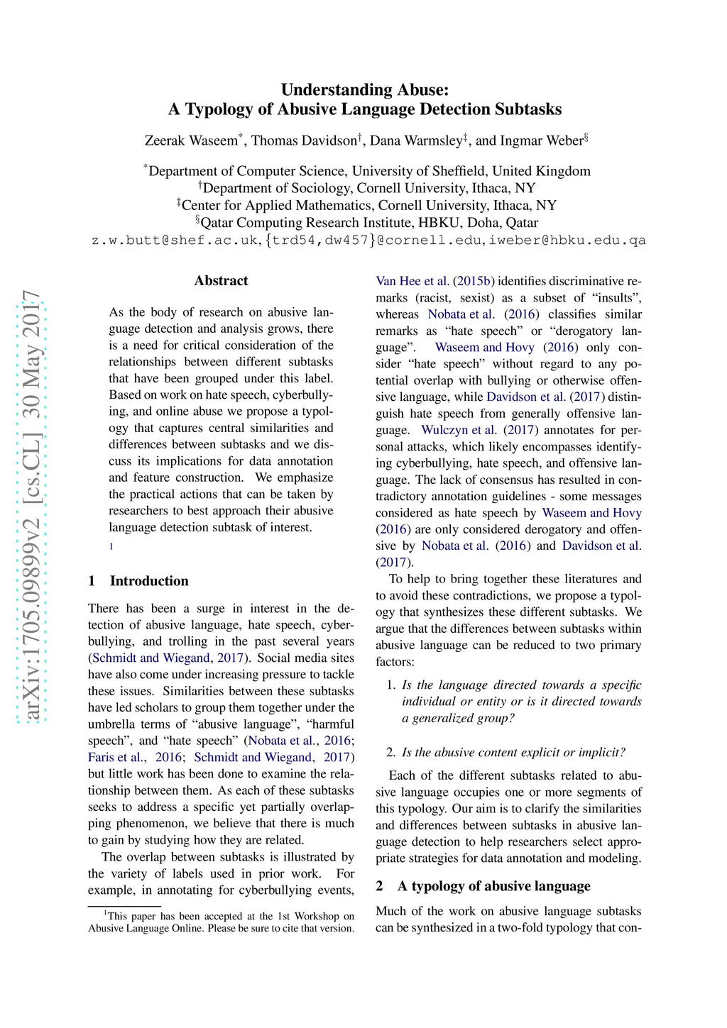 As the body of research on abusive language detection and analysis grows, there is a need for critical consideration of the relationships between different subtasks that have been grouped under this label. Based on work on hate speech, cyberbullying, and online abuse we propose a typology that captures central similarities and differences between subtasks and we discuss its implications for data annotation and feature construction. We emphasize the practical actions that can be taken by researchers to best approach their abusive language detection subtask of interest.
