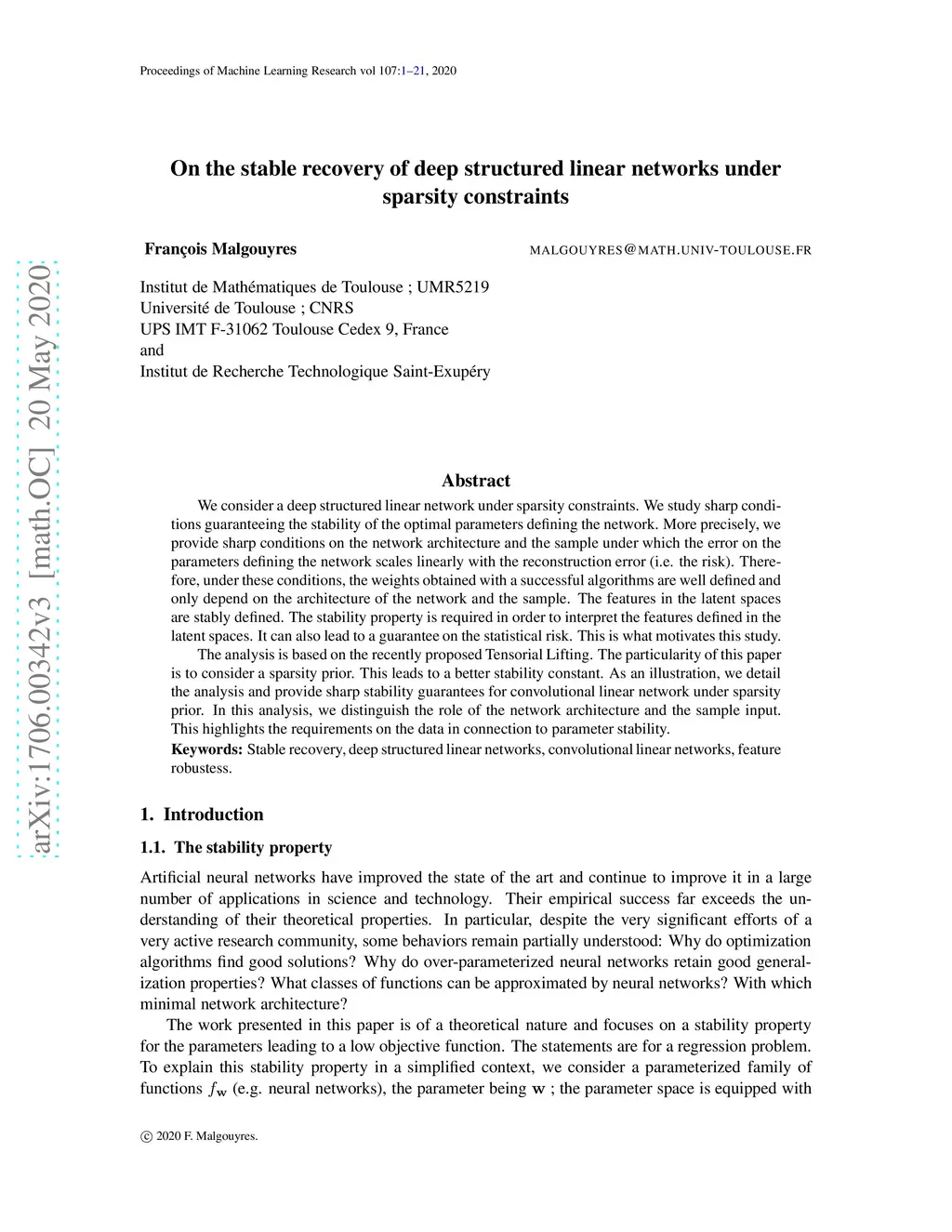 We consider a deep structured linear network under sparsity constraints. We study sharp conditions guaranteeing the stability of the optimal parameters defining the network. More precisely, we provide sharp conditions on the network architecture and the sample under which the error on the parameters defining the network scales linearly with the reconstruction error (i.e. the risk). Therefore, under these conditions, the weights obtained with a successful algorithms are well defined and only depend on the architecture of the network and the sample. The features in the latent spaces are stably defined. The stability property is required in order to interpret the features defined in the latent spaces. It can also lead to a guarantee on the statistical risk. This is what motivates this study. The analysis is based on the recently proposed Tensorial Lifting. The particularity of this paper is to consider a sparsity prior. This leads to a better stability constant. As an illustration, we detail the analysis and provide sharp stability guarantees for convolutional linear network under sparsity prior. In this analysis, we distinguish the role of the network architecture and the sample input. This highlights the requirements on the data in connection to parameter stability.