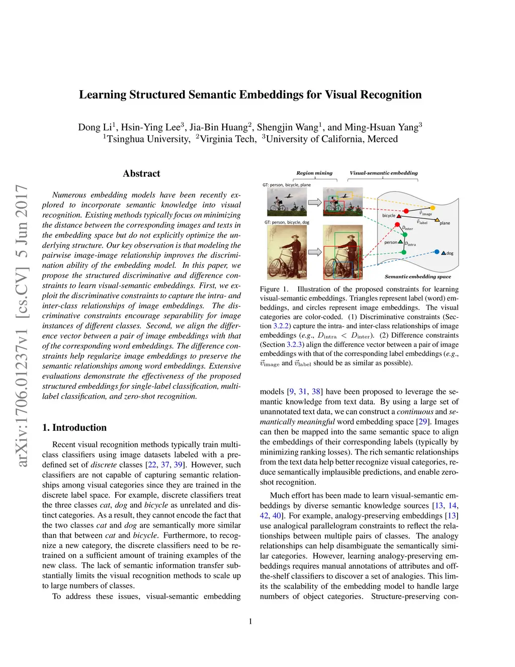 Numerous embedding models have been recently explored to incorporate semantic knowledge into visual recognition. Existing methods typically focus on minimizing the distance between the corresponding images and texts in the embedding space but do not explicitly optimize the underlying structure. Our key observation is that modeling the pairwise image-image relationship improves the discrimination ability of the embedding model. In this paper, we propose the structured discriminative and difference constraints to learn visual-semantic embeddings. First, we exploit the discriminative constraints to capture the intra- and inter-class relationships of image embeddings. The discriminative constraints encourage separability for image instances of different classes. Second, we align the difference vector between a pair of image embeddings with that of the corresponding word embeddings. The difference constraints help regularize image embeddings to preserve the semantic relationships among word embeddings. Extensive evaluations demonstrate the effectiveness of the proposed structured embeddings for single-label classification, multi-label classification, and zero-shot recognition.
