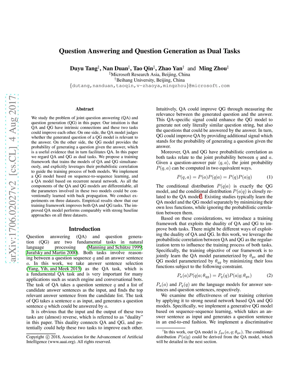 Question Answering and Question Generation as Dual Tasks