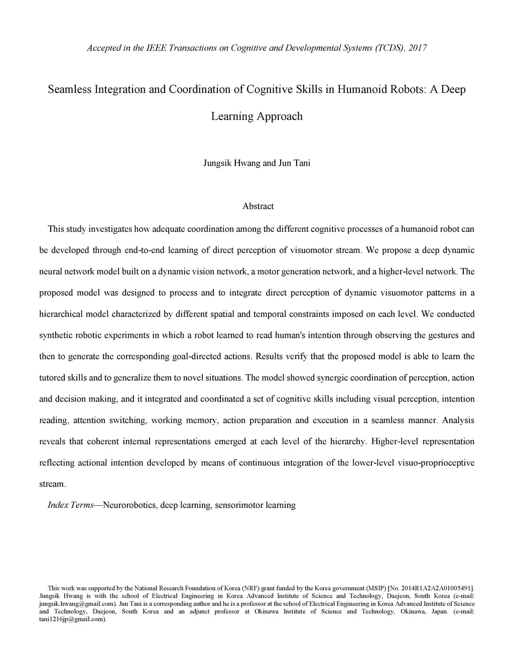 This study investigates how adequate coordination among the different cognitive processes of a humanoid robot can be developed through end-to-end learning of direct perception of visuomotor stream. We propose a deep dynamic neural network model built on a dynamic vision network, a motor generation network, and a higher-level network. The proposed model was designed to process and to integrate direct perception of dynamic visuomotor patterns in a hierarchical model characterized by different spatial and temporal constraints imposed on each level. We conducted synthetic robotic experiments in which a robot learned to read human's intention through observing the gestures and then to generate the corresponding goal-directed actions. Results verify that the proposed model is able to learn the tutored skills and to generalize them to novel situations. The model showed synergic coordination of perception, action and decision making, and it integrated and coordinated a set of cognitive skills including visual perception, intention reading, attention switching, working memory, action preparation and execution in a seamless manner. Analysis reveals that coherent internal representations emerged at each level of the hierarchy. Higher-level representation reflecting actional intention developed by means of continuous integration of the lower-level visuo-proprioceptive stream.