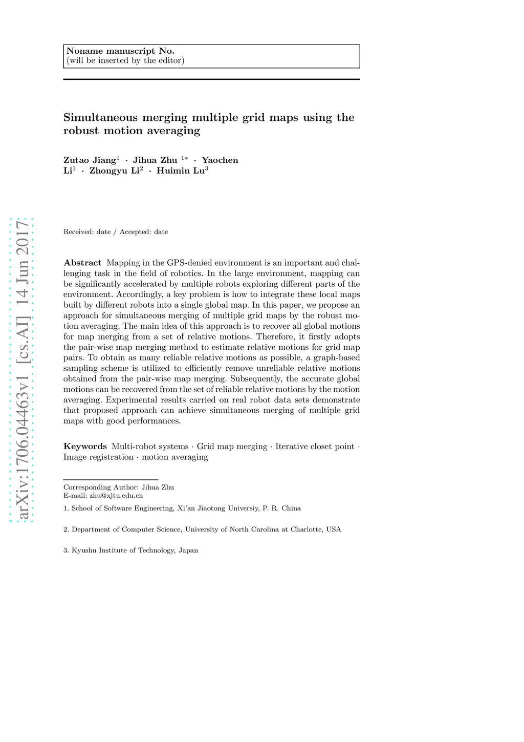 Mapping in the GPS-denied environment is an important and challenging task in the field of robotics. In the large environment, mapping can be significantly accelerated by multiple robots exploring different parts of the environment. Accordingly, a key problem is how to integrate these local maps built by different robots into a single global map. In this paper, we propose an approach for simultaneous merging of multiple grid maps by the robust motion averaging. The main idea of this approach is to recover all global motions for map merging from a set of relative motions. Therefore, it firstly adopts the pair-wise map merging method to estimate relative motions for grid map pairs. To obtain as many reliable relative motions as possible, a graph-based sampling scheme is utilized to efficiently remove unreliable relative motions obtained from the pair-wise map merging. Subsequently, the accurate global motions can be recovered from the set of reliable relative motions by the motion averaging. Experimental results carried on real robot data sets demonstrate that proposed approach can achieve simultaneous merging of multiple grid maps with good performances.