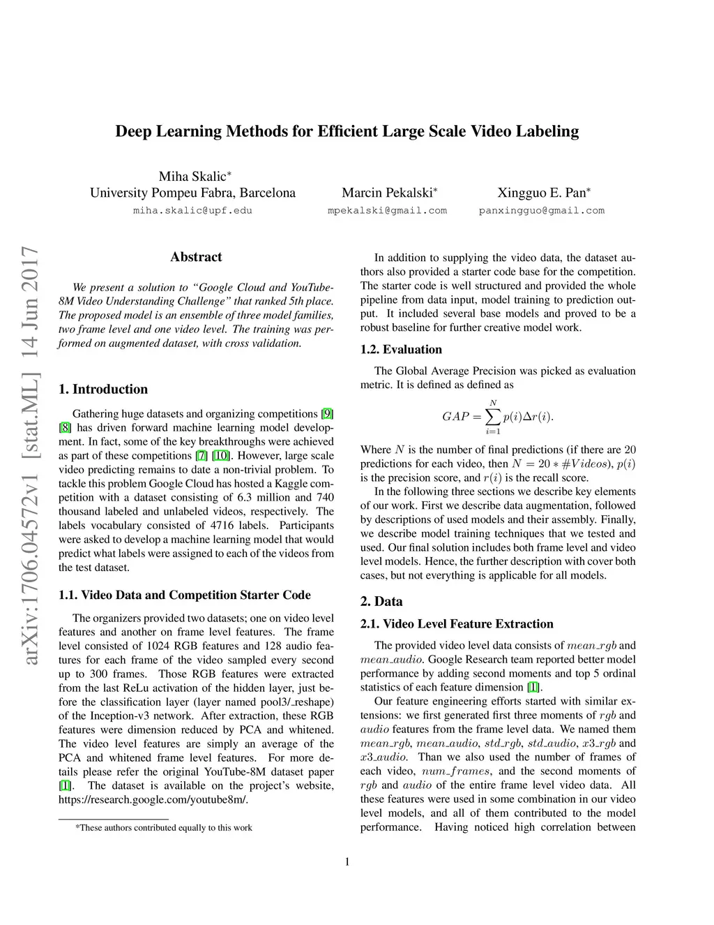 Deep Learning Methods for Efficient Large Scale Video Labeling