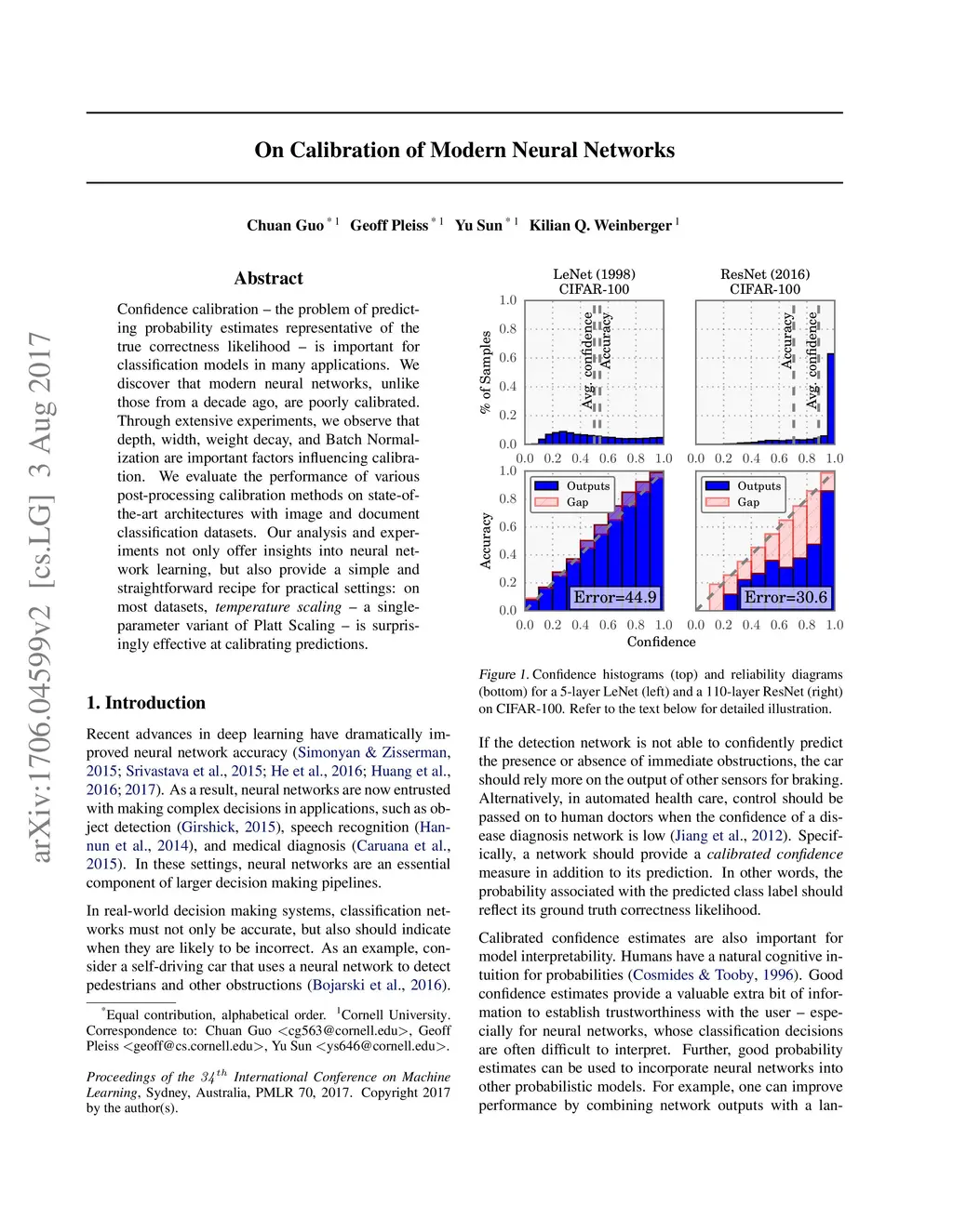 Confidence calibration -- the problem of predicting probability estimates representative of the true correctness likelihood -- is important for classification models in many applications. We discover that modern neural networks, unlike those from a decade ago, are poorly calibrated. Through extensive experiments, we observe that depth, width, weight decay, and Batch Normalization are important factors influencing calibration. We evaluate the performance of various post-processing calibration methods on state-of-the-art architectures with image and document classification datasets. Our analysis and experiments not only offer insights into neural network learning, but also provide a simple and straightforward recipe for practical settings: on most datasets, temperature scaling -- a single-parameter variant of Platt Scaling -- is surprisingly effective at calibrating predictions.