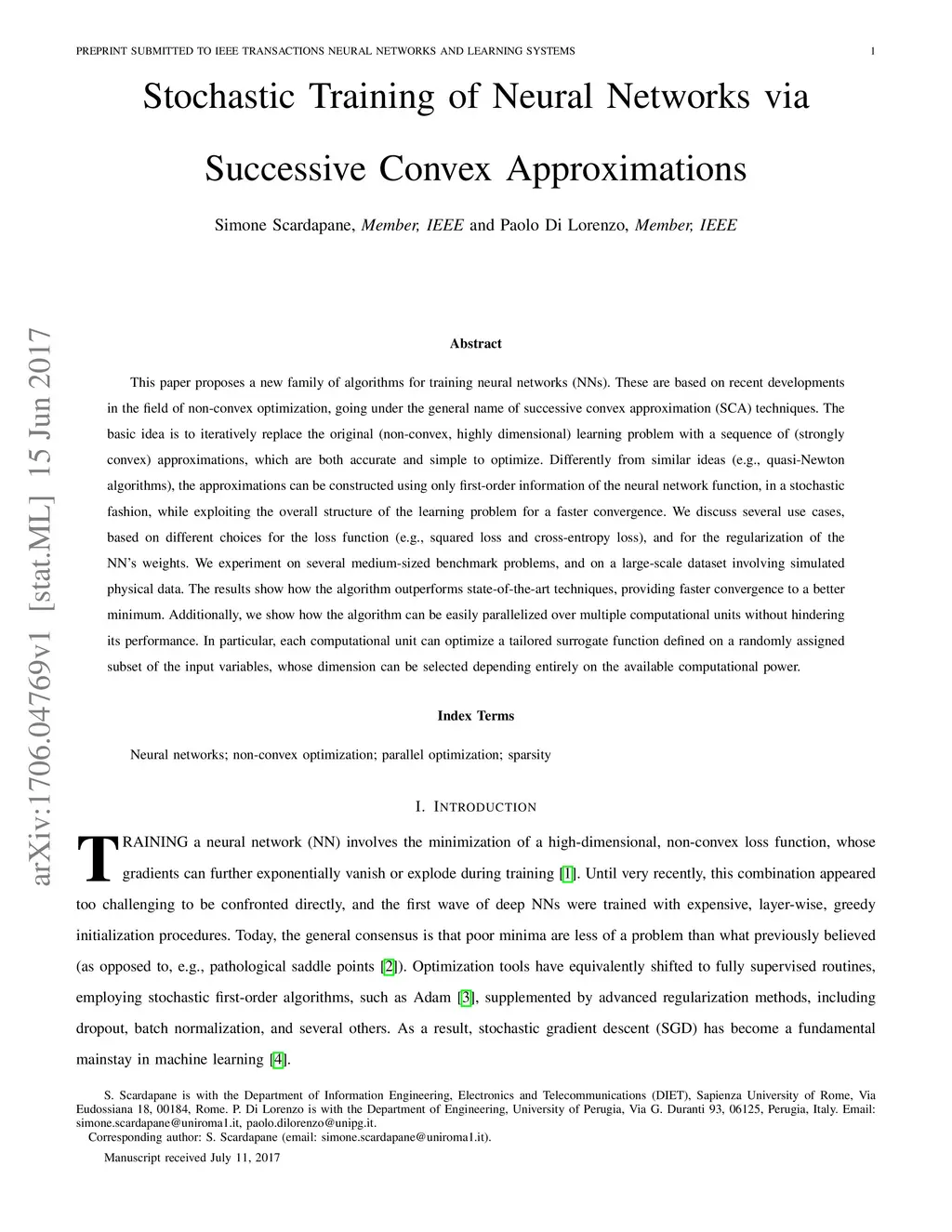 This paper proposes a new family of algorithms for training neural networks (NNs). These are based on recent developments in the field of non-convex optimization, going under the general name of successive convex approximation (SCA) techniques. The basic idea is to iteratively replace the original (non-convex, highly dimensional) learning problem with a sequence of (strongly convex) approximations, which are both accurate and simple to optimize. Differently from similar ideas (e.g., quasi-Newton algorithms), the approximations can be constructed using only first-order information of the neural network function, in a stochastic fashion, while exploiting the overall structure of the learning problem for a faster convergence. We discuss several use cases, based on different choices for the loss function (e.g., squared loss and cross-entropy loss), and for the regularization of the NN's weights. We experiment on several medium-sized benchmark problems, and on a large-scale dataset involving simulated physical data. The results show how the algorithm outperforms state-of-the-art techniques, providing faster convergence to a better minimum. Additionally, we show how the algorithm can be easily parallelized over multiple computational units without hindering its performance. In particular, each computational unit can optimize a tailored surrogate function defined on a randomly assigned subset of the input variables, whose dimension can be selected depending entirely on the available computational power.