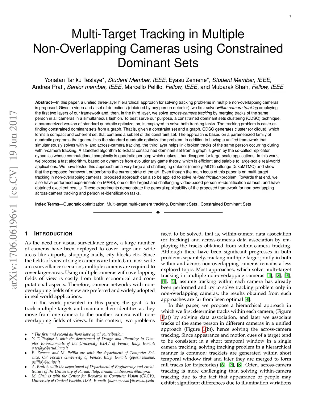 In this paper, a unified three-layer hierarchical approach for solving tracking problems in multiple non-overlapping cameras is proposed. Given a video and a set of detections (obtained by any person detector), we first solve within-camera tracking employing the first two layers of our framework and, then, in the third layer, we solve across-camera tracking by merging tracks of the same person in all cameras in a simultaneous fashion. To best serve our purpose, a constrained dominant sets clustering (CDSC) technique, a parametrized version of standard quadratic optimization, is employed to solve both tracking tasks. The tracking problem is caste as finding constrained dominant sets from a graph. In addition to having a unified framework that simultaneously solves within- and across-camera tracking, the third layer helps link broken tracks of the same person occurring during within-camera tracking. In this work, we propose a fast algorithm, based on dynamics from evolutionary game theory, which is efficient and salable to large-scale real-world applications.