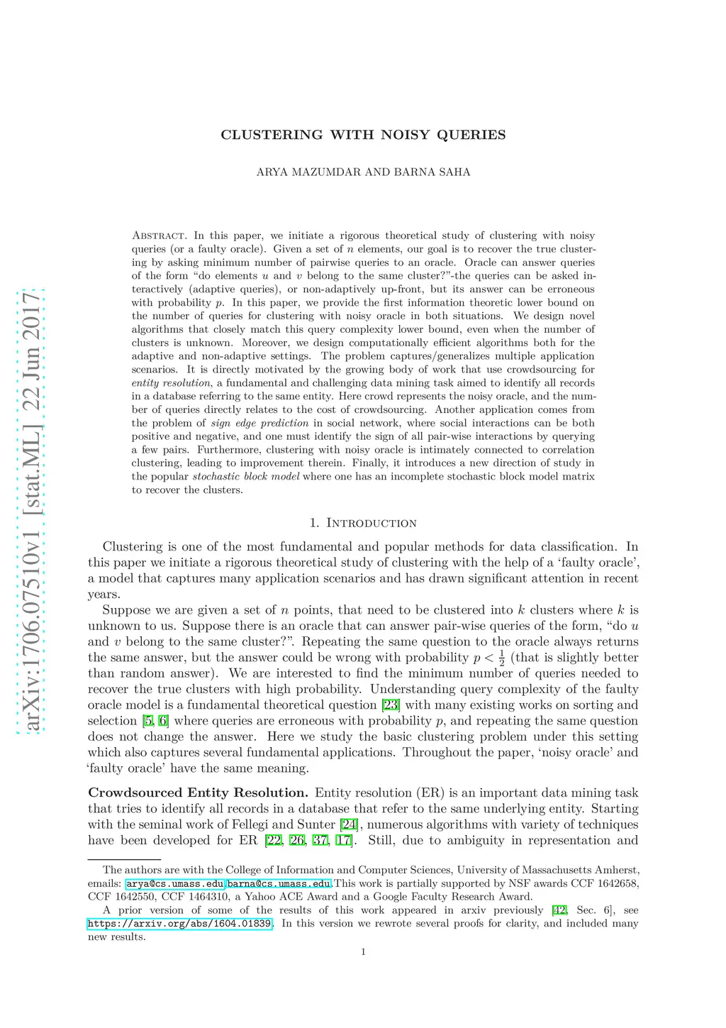 In this paper, we initiate a rigorous theoretical study of clustering with noisy queries (or a faulty oracle). Given a set of elements, our goal is to recover the true clustering by asking minimum number of pairwise queries to an oracle. Oracle can answer queries of the form : "do elements and belong to the same cluster?" -- the queries can be asked interactively (adaptive queries), or non-adaptively up-front, but its answer can be erroneous with probability . In this paper, we provide the first information theoretic lower bound on the number of queries for clustering with noisy oracle in both situations. We design novel algorithms that closely match this query complexity lower bound, even when the number of clusters is unknown. Moreover, we design computationally efficient algorithms both for the adaptive and non-adaptive settings. The problem captures/generalizes multiple application scenarios. It is directly motivated by the growing body of work that use crowdsourcing for {\em entity resolution}, a fundamental and challenging data mining task aimed to identify all records in a database referring to the same entity. Here crowd represents the noisy oracle, and the number of queries directly relates to the cost of crowdsourcing. Another application comes from the problem of {\em sign edge prediction} in social network, where social interactions can be both positive and negative, and one must identify the sign of all pair-wise interactions by querying a few pairs. Furthermore, clustering with noisy oracle is intimately connected to correlation clustering, leading to improvement therein. Finally, it introduces a new direction of study in the popular {\em stochastic block model} where one has an incomplete stochastic block model matrix to recover the clusters.