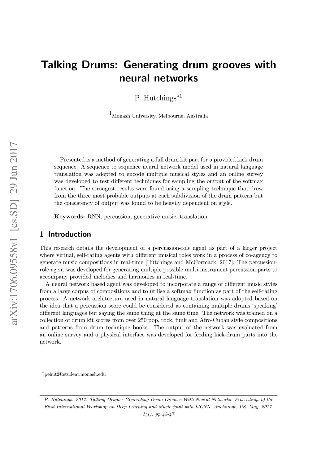 Presented is a method of generating a full drum kit part for a provided kick-drum sequence. A sequence to sequence neural network model used in natural language translation was adopted to encode multiple musical styles and an online survey was developed to test different techniques for sampling the output of the softmax function. The strongest results were found using a sampling technique that drew from the three most probable outputs at each subdivision of the drum pattern but the consistency of output was found to be heavily dependent on style.
