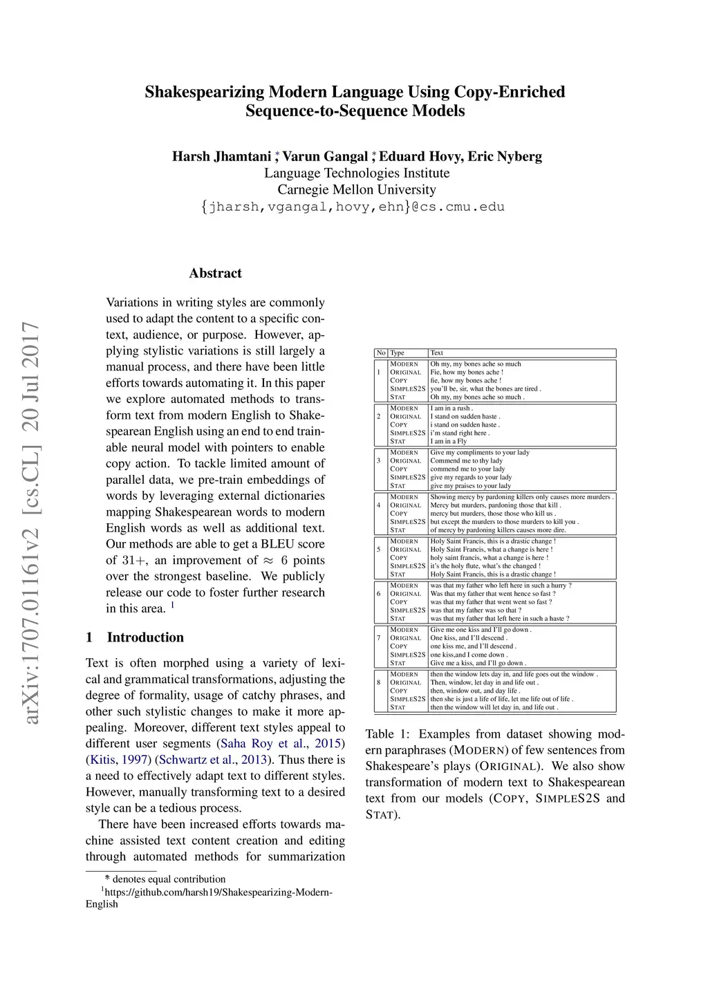 Shakespearizing Modern Language Using Copy-Enriched Sequence-to-Sequence