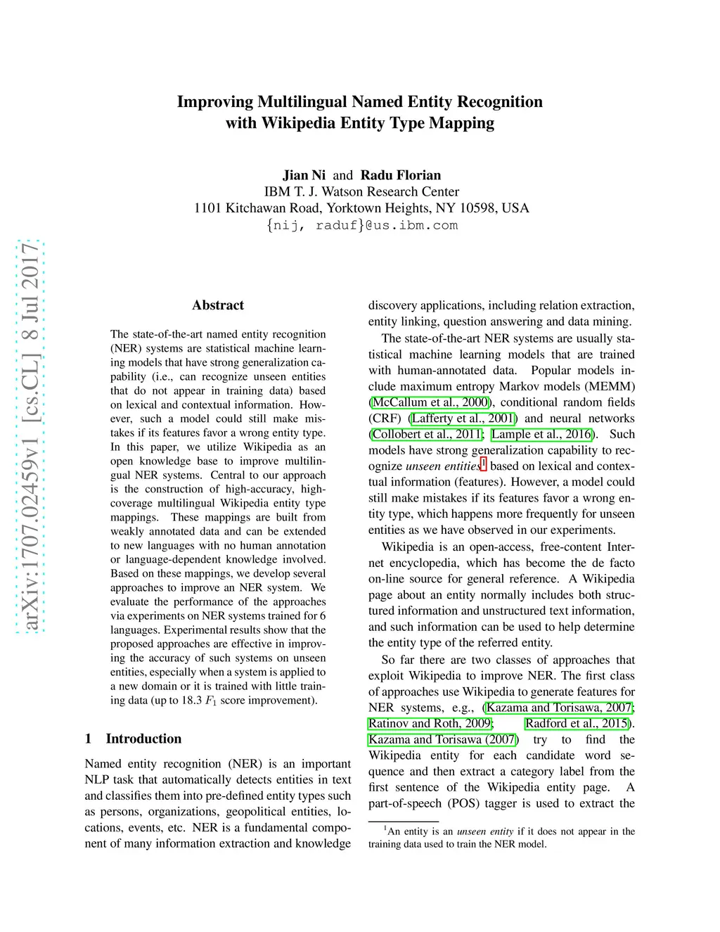 Improving Multilingual Named Entity Recognition with Wikipedia Entity