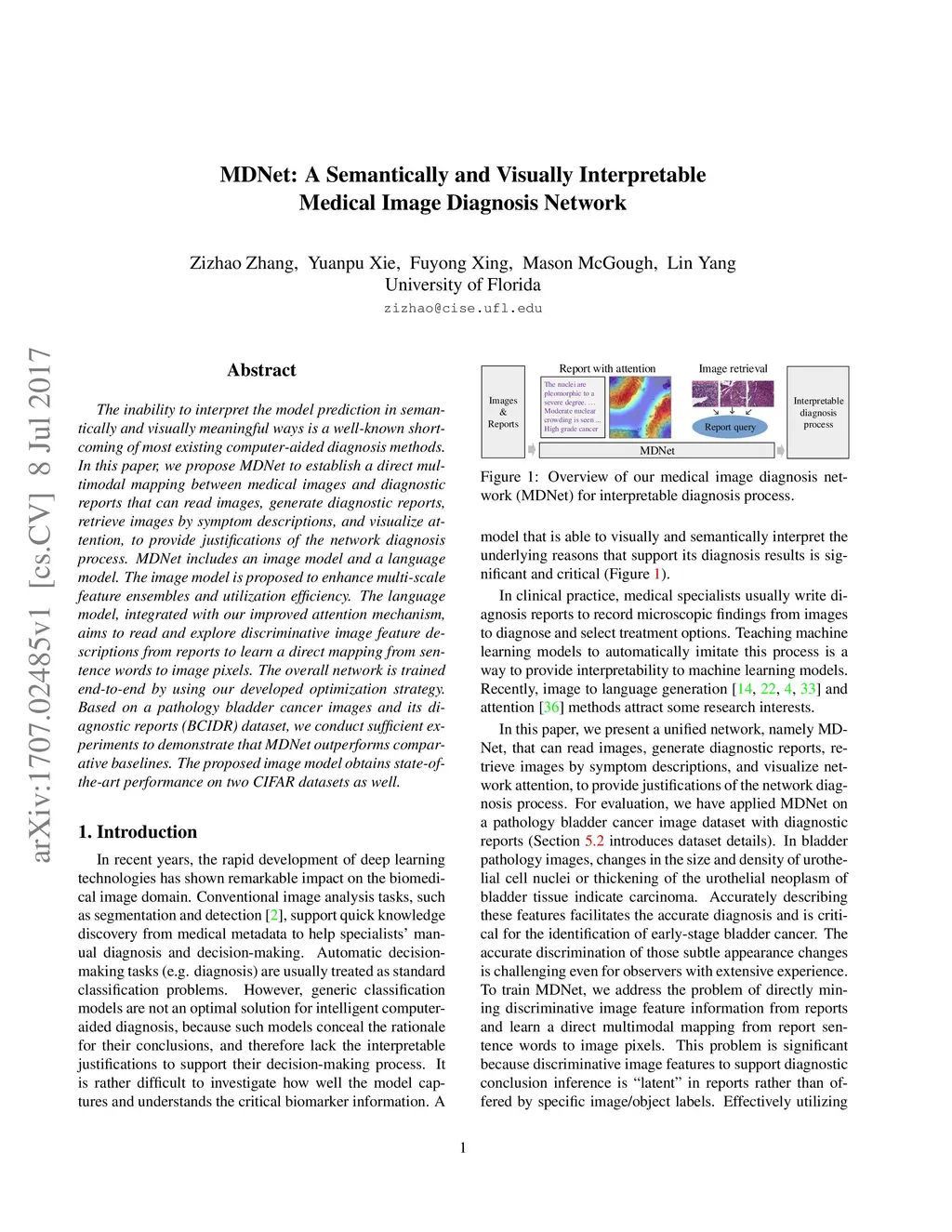 The inability to interpret the model prediction in semantically and visually meaningful ways is a well-known shortcoming of most existing computer-aided diagnosis methods. In this paper, we propose MDNet to establish a direct multimodal mapping between medical images and diagnostic reports that can read images, generate diagnostic reports, retrieve images by symptom descriptions, and visualize attention, to provide justifications of the network diagnosis process. MDNet includes an image model and a language model. The image model is proposed to enhance multi-scale feature ensembles and utilization efficiency. The language model, integrated with our improved attention mechanism, aims to read and explore discriminative image feature descriptions from reports to learn a direct mapping from sentence words to image pixels. The overall network is trained end-to-end by using our developed optimization strategy. Based on a pathology bladder cancer images and its diagnostic reports (BCIDR) dataset, we conduct sufficient experiments to demonstrate that MDNet outperforms comparative baselines. The proposed image model obtains state-of-the-art performance on two CIFAR datasets as well.