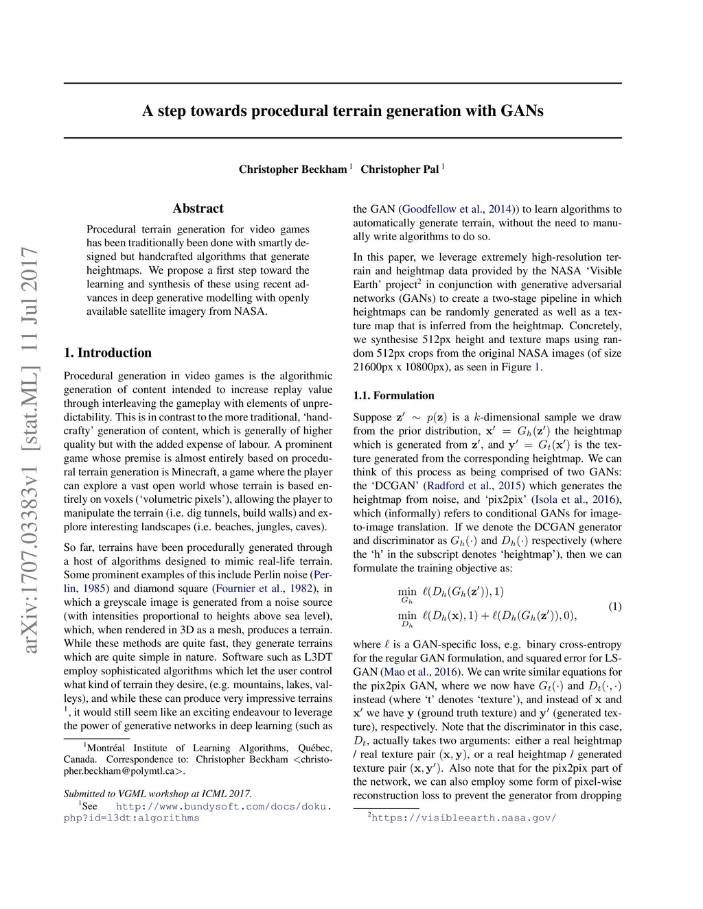 Procedural terrain generation for video games has been traditionally been done with smartly designed but handcrafted algorithms that generate heightmaps. We propose a first step toward the learning and synthesis of these using recent advances in deep generative modelling with openly available satellite imagery from NASA.