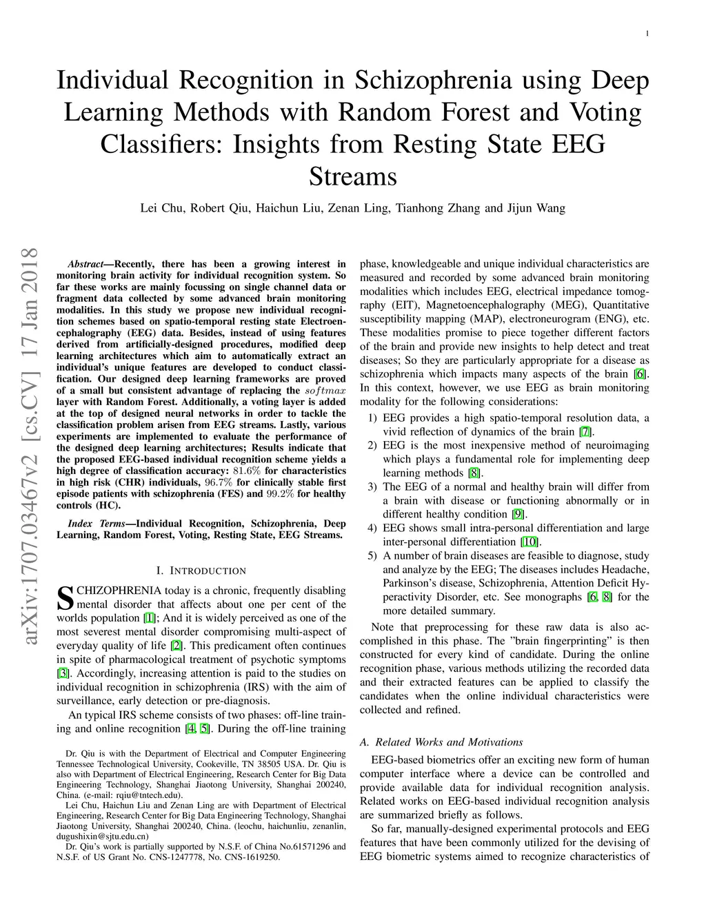 Recently, there has been a growing interest in monitoring brain activity for individual recognition system. So far these works are mainly focussing on single channel data or fragment data collected by some advanced brain monitoring modalities. In this study we propose new individual recognition schemes based on spatio-temporal resting state Electroencephalography (EEG) data. Besides, instead of using features derived from artificially-designed procedures, modified deep learning architectures which aim to automatically extract an individual's unique features are developed to conduct classification. Our designed deep learning frameworks are proved of a small but consistent advantage of replacing the layer with Random Forest. Additionally, a voting layer is added at the top of designed neural networks in order to tackle the classification problem arisen from EEG streams. Lastly, various experiments are implemented to evaluate the performance of the designed deep learning architectures; Results indicate that the proposed EEG-based individual recognition scheme yields a high degree of classification accuracy: for characteristics in high risk (CHR) individuals, for clinically stable first episode patients with schizophrenia (FES) and for healthy controls (HC).