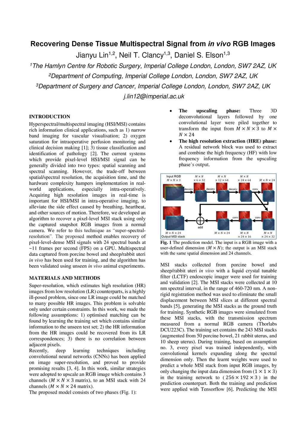 Hyperspectral/multispectral imaging (HSI/MSI) contains rich information clinical applications, such as 1) narrow band imaging for vascular visualisation; 2) oxygen saturation for intraoperative perfusion monitoring and clinical decision making [1]; 3) tissue classification and identification of pathology [2]. The current systems which provide pixel-level HSI/MSI signal can be generally divided into two types: spatial scanning and spectral scanning. However, the trade-off between spatial/spectral resolution, the acquisition time, and the hardware complexity hampers implementation in real-world applications, especially intra-operatively. Acquiring high resolution images in real-time is important for HSI/MSI in intra-operative imaging, to alleviate the side effect caused by breathing, heartbeat, and other sources of motion. Therefore, we developed an algorithm to recover a pixel-level MSI stack using only the captured snapshot RGB images from a normal camera. We refer to this technique as "super-spectral-resolution". The proposed method enables recovery of pixel-level-dense MSI signals with 24 spectral bands at ~11 frames per second (FPS) on a GPU. Multispectral data captured from porcine bowel and sheep/rabbit uteri in vivo has been used for training, and the algorithm has been validated using unseen in vivo animal experiments.