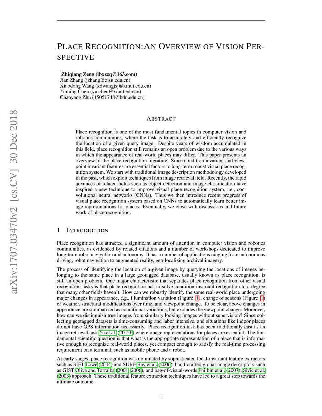 Place recognition is one of the most fundamental topics in computer vision and robotics communities, where the task is to accurately and efficiently recognize the location of a given query image. Despite years of wisdom accumulated in this field, place recognition still remains an open problem due to the various ways in which the appearance of real-world places may differ. This paper presents an overview of the place recognition literature. Since condition invariant and viewpoint invariant features are essential factors to long-term robust visual place recognition system, We start with traditional image description methodology developed in the past, which exploit techniques from image retrieval field. Recently, the rapid advances of related fields such as object detection and image classification have inspired a new technique to improve visual place recognition system, i.e., convolutional neural networks (CNNs). Thus we then introduce recent progress of visual place recognition system based on CNNs to automatically learn better image representations for places. Eventually, we close with discussions and future work of place recognition.