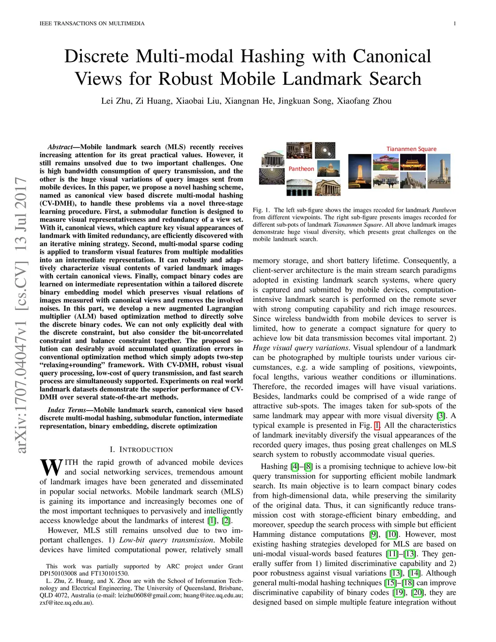 Discrete Multi-modal Hashing with Canonical Views for Robust Mobile