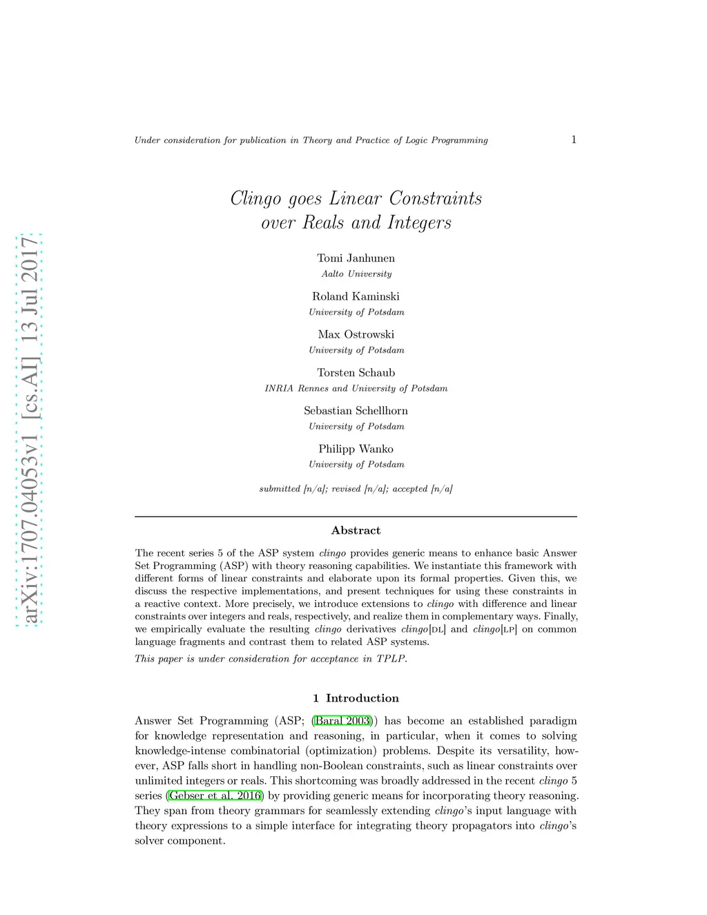 The recent series 5 of the ASP system clingo provides generic means to enhance basic Answer Set Programming (ASP) with theory reasoning capabilities. We instantiate this framework with different forms of linear constraints, discuss the respective implementations, and present techniques of how to use these constraints in a reactive context. More precisely, we introduce extensions to clingo with difference and linear constraints over integers and reals, respectively, and realize them in complementary ways. Finally, we empirically evaluate the resulting clingo derivatives clingo[dl] and clingo[lp] on common fragments and contrast them to related ASP systems. This paper is under consideration for acceptance in TPLP.