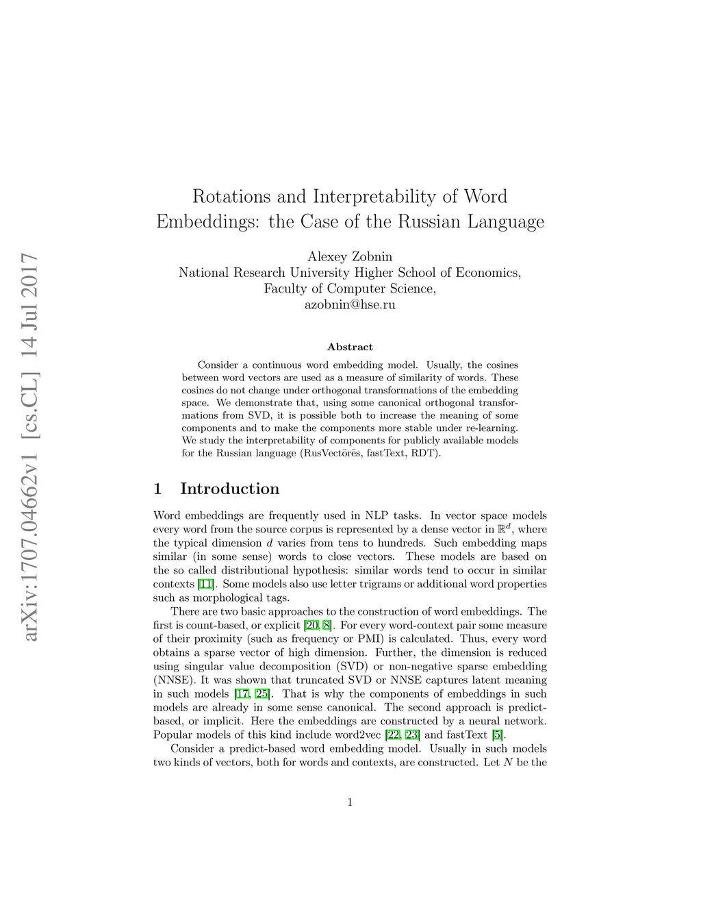 Consider a continuous word embedding model. Usually, the cosines between word vectors are used as a measure of similarity of words. These cosines do not change under orthogonal transformations of the embedding space. We demonstrate that, using some canonical orthogonal transformations from SVD, it is possible both to increase the meaning of some components and to make the components more stable under re-learning. We study the interpretability of components for publicly available models for the Russian language (RusVectores, fastText, RDT).