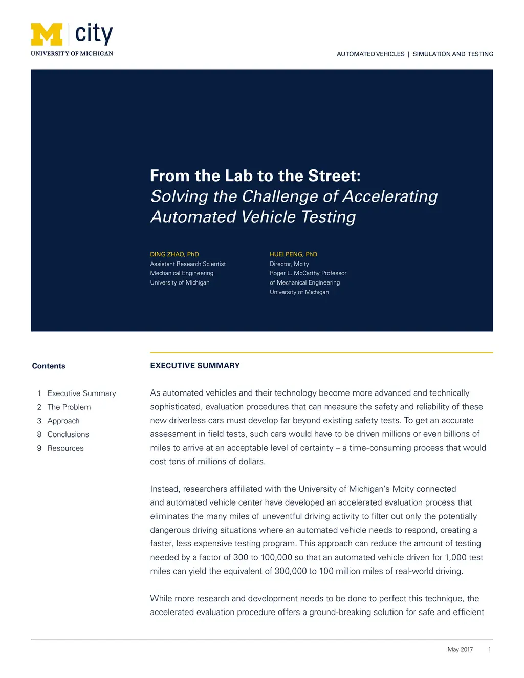 As automated vehicles and their technology become more advanced and technically sophisticated, evaluation procedures that can measure the safety and reliability of these new driverless cars must develop far beyond existing safety tests. To get an accurate assessment in field tests, such cars would have to be driven millions or even billions of miles to arrive at an acceptable level of certainty - a time-consuming process that would cost tens of millions of dollars. Instead, researchers affiliated with the University of Michigan's Mcity connected and automated vehicle center have developed an accelerated evaluation process that eliminates the many miles of uneventful driving activity to filter out only the potentially dangerous driving situations where an automated vehicle needs to respond, creating a faster, less expensive testing program. This approach can reduce the amount of testing needed by a factor of 300 to 100,000 so that an automated vehicle driven for 1,000 test miles can yield the equivalent of 300,000 to 100 million miles of real-world driving. While more research and development needs to be done to perfect this technique, the accelerated evaluation procedure offers a ground-breaking solution for safe and efficient testing that is crucial to deploying automated vehicles.