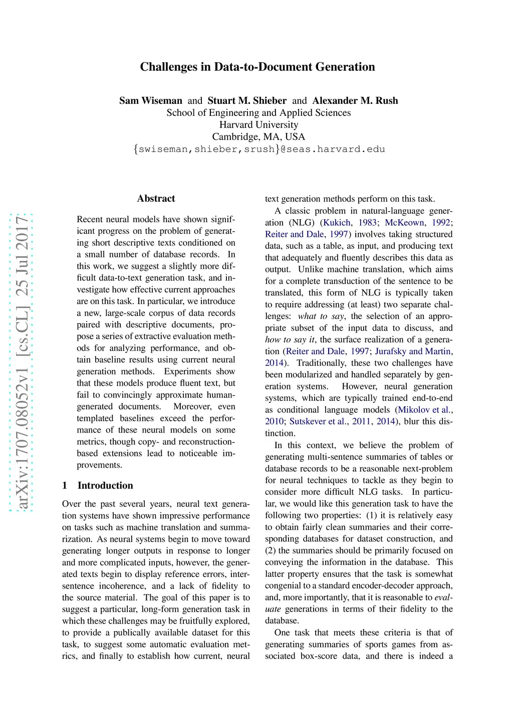 Challenges in Data-to-Document Generation