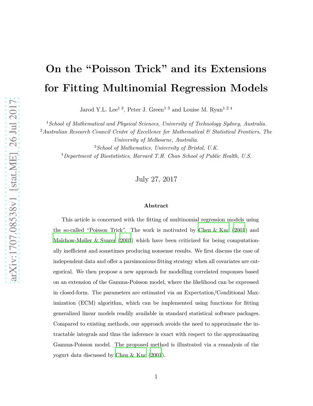 This article is concerned with the fitting of multinomial regression models using the so-called "Poisson Trick". The work is motivated by Chen & Kuo (2001) and Malchow-M{\o}ller & Svarer (2003) which have been criticized for being computationally inefficient and sometimes producing nonsense results. We first discuss the case of independent data and offer a parsimonious fitting strategy when all covariates are categorical. We then propose a new approach for modelling correlated responses based on an extension of the Gamma-Poisson model, where the likelihood can be expressed in closed-form. The parameters are estimated via an Expectation/Conditional Maximization (ECM) algorithm, which can be implemented using functions for fitting generalized linear models readily available in standard statistical software packages. Compared to existing methods, our approach avoids the need to approximate the intractable integrals and thus the inference is exact with respect to the approximating Gamma-Poisson model. The proposed method is illustrated via a reanalysis of the yogurt data discussed by Chen & Kuo (2001).