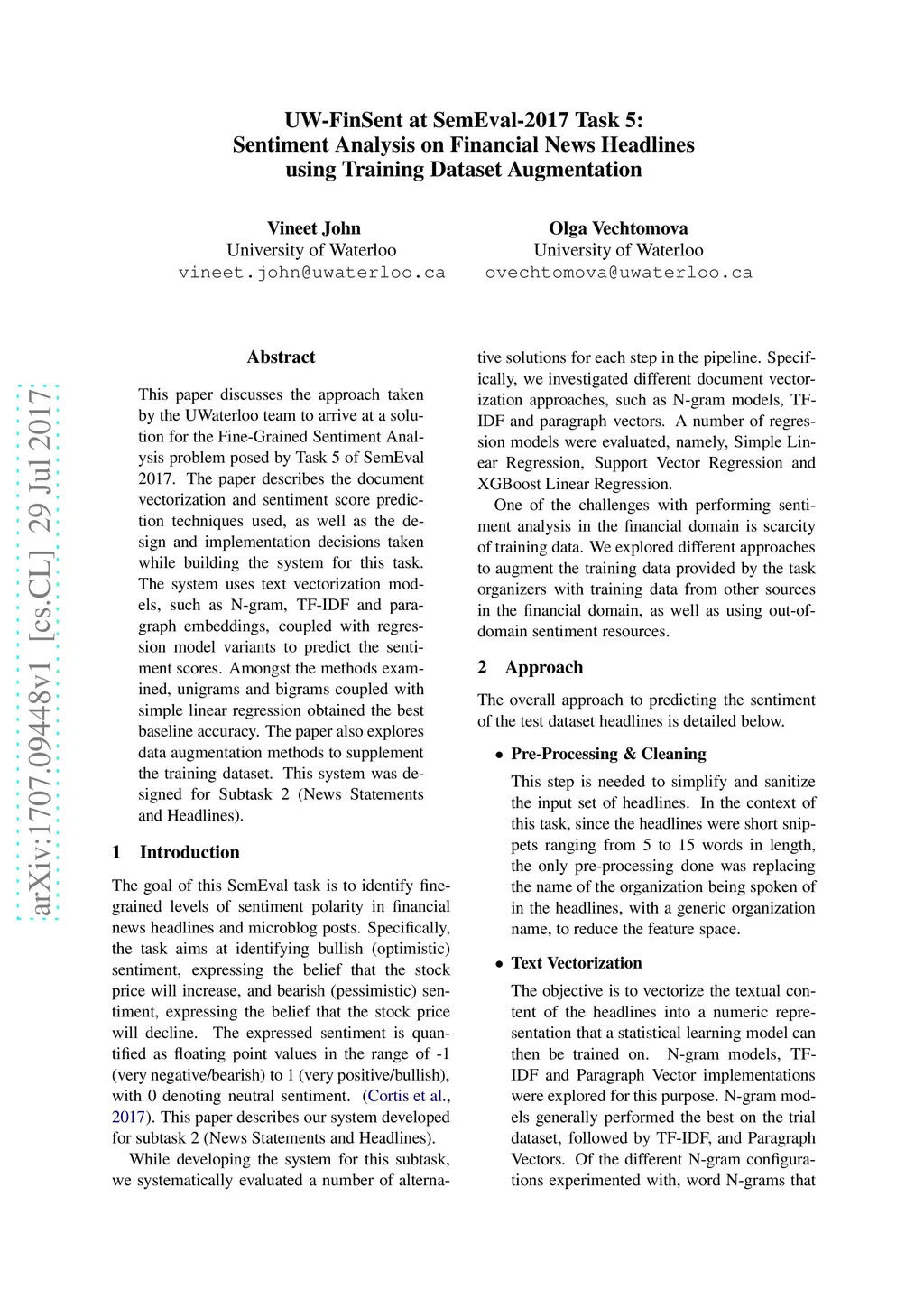 This paper discusses the approach taken by the UWaterloo team to arrive at a solution for the Fine-Grained Sentiment Analysis problem posed by Task 5 of SemEval 2017. The paper describes the document vectorization and sentiment score prediction techniques used, as well as the design and implementation decisions taken while building the system for this task. The system uses text vectorization models, such as N-gram, TF-IDF and paragraph embeddings, coupled with regression model variants to predict the sentiment scores. Amongst the methods examined, unigrams and bigrams coupled with simple linear regression obtained the best baseline accuracy. The paper also explores data augmentation methods to supplement the training dataset. This system was designed for Subtask 2 (News Statements and Headlines).