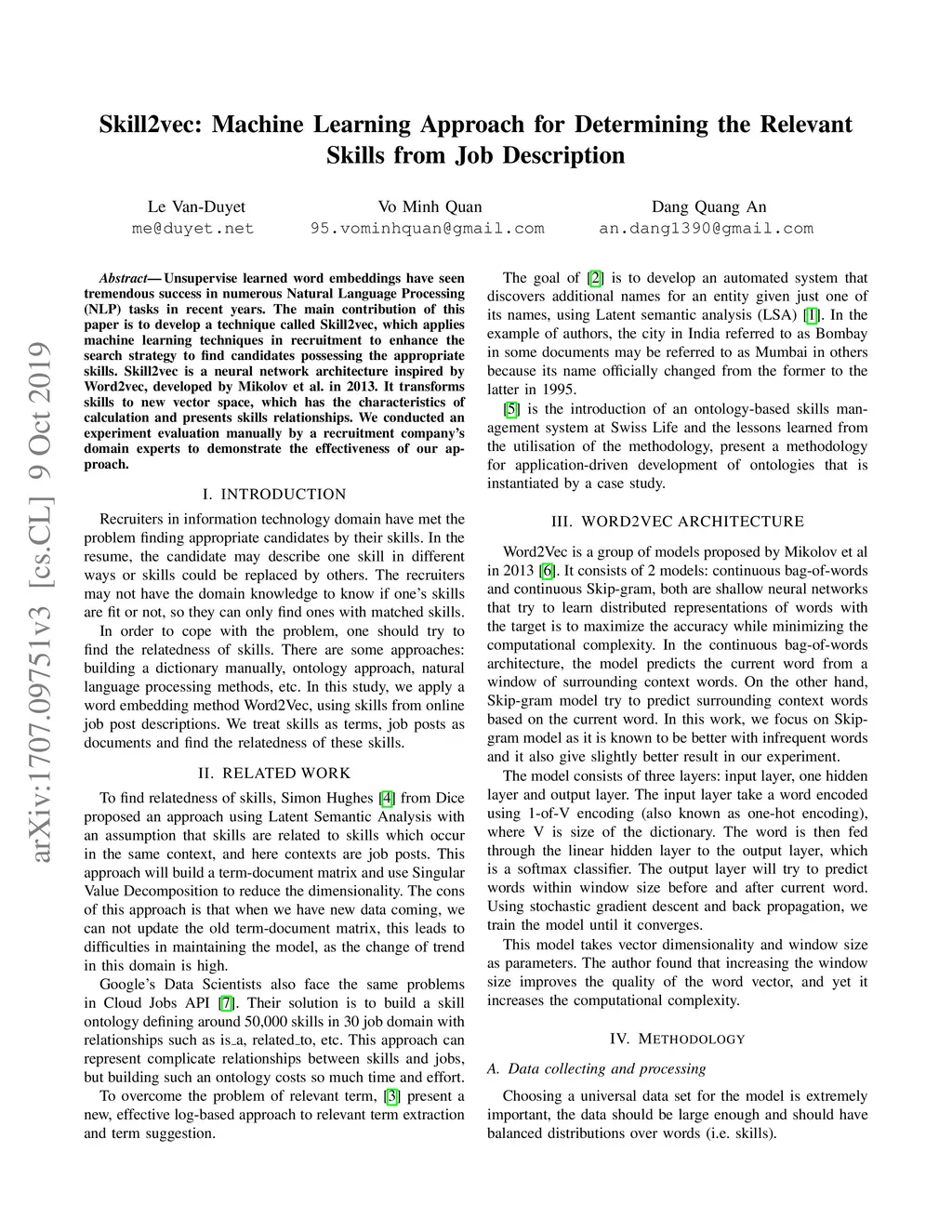 Skill2vec: Machine Learning Approach for Determining the Relevant Skills