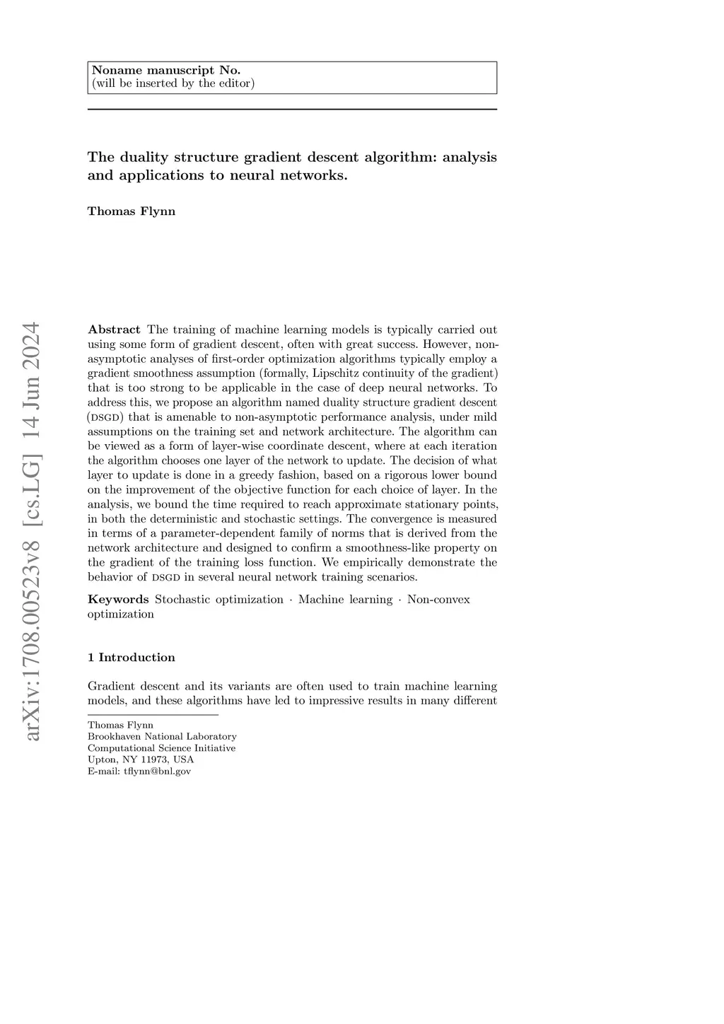 The training of machine learning models is typically carried out using some form of gradient descent, often with great success. However, non-asymptotic analyses of first-order optimization algorithms typically employ a gradient smoothness assumption (formally, Lipschitz continuity of the gradient) that is too strong to be applicable in the case of deep neural networks. To address this, we propose an algorithm named duality structure gradient descent (DSGD) that is amenable to non-asymptotic performance analysis, under mild assumptions on the training set and network architecture. The algorithm can be viewed as a form of layer-wise coordinate descent, where at each iteration the algorithm chooses one layer of the network to update. The decision of what layer to update is done in a greedy fashion, based on a rigorous lower bound on the improvement of the objective function for each choice of layer. In the analysis, we bound the time required to reach approximate stationary points, in both the deterministic and stochastic settings. The convergence is measured in terms of a parameter-dependent family of norms that is derived from the network architecture and designed to confirm a smoothness-like property on the gradient of the training loss function. We empirically demonstrate the behavior of DSGD in several neural network training scenarios.