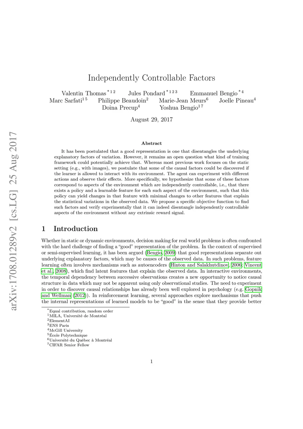 It has been postulated that a good representation is one that disentangles the underlying explanatory factors of variation. However, it remains an open question what kind of training framework could potentially achieve that. Whereas most previous work focuses on the static setting (e.g., with images), we postulate that some of the causal factors could be discovered if the learner is allowed to interact with its environment. The agent can experiment with different actions and observe their effects. More specifically, we hypothesize that some of these factors correspond to aspects of the environment which are independently controllable, i.e., that there exists a policy and a learnable feature for each such aspect of the environment, such that this policy can yield changes in that feature with minimal changes to other features that explain the statistical variations in the observed data. We propose a specific objective function to find such factors and verify experimentally that it can indeed disentangle independently controllable aspects of the environment without any extrinsic reward signal.