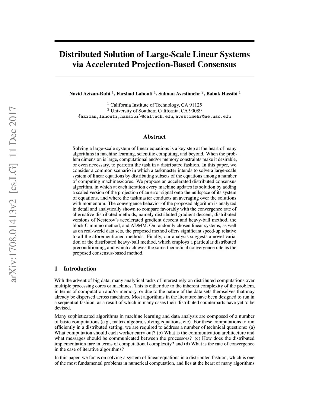 Solving a large-scale system of linear equations is a key step at the heart of many algorithms in machine learning, scientific computing, and beyond. When the problem dimension is large, computational and/or memory constraints make it desirable, or even necessary, to perform the task in a distributed fashion. In this paper, we consider a common scenario in which a taskmaster intends to solve a large-scale system of linear equations by distributing subsets of the equations among a number of computing machines/cores. We propose an accelerated distributed consensus algorithm, in which at each iteration every machine updates its solution by adding a scaled version of the projection of an error signal onto the nullspace of its system of equations, and where the taskmaster conducts an averaging over the solutions with momentum. The convergence behavior of the proposed algorithm is analyzed in detail and analytically shown to compare favorably with the convergence rate of alternative distributed methods, namely distributed gradient descent, distributed versions of Nesterov's accelerated gradient descent and heavy-ball method, the block Cimmino method, and ADMM. On randomly chosen linear systems, as well as on real-world data sets, the proposed method offers significant speed-up relative to all the aforementioned methods. Finally, our analysis suggests a novel variation of the distributed heavy-ball method, which employs a particular distributed preconditioning, and which achieves the same theoretical convergence rate as the proposed consensus-based method.