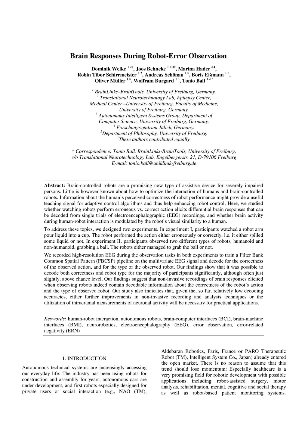 Brain-controlled robots are a promising new type of assistive device for severely impaired persons. Little is however known about how to optimize the interaction of humans and brain-controlled robots. Information about the human's perceived correctness of robot performance might provide a useful teaching signal for adaptive control algorithms and thus help enhancing robot control. Here, we studied whether watching robots perform erroneous vs. correct action elicits differential brain responses that can be decoded from single trials of electroencephalographic (EEG) recordings, and whether brain activity during human-robot interaction is modulated by the robot's visual similarity to a human. To address these topics, we designed two experiments. In experiment I, participants watched a robot arm pour liquid into a cup. The robot performed the action either erroneously or correctly, i.e. it either spilled some liquid or not. In experiment II, participants observed two different types of robots, humanoid and non-humanoid, grabbing a ball. The robots either managed to grab the ball or not. We recorded high-resolution EEG during the observation tasks in both experiments to train a Filter Bank Common Spatial Pattern (FBCSP) pipeline on the multivariate EEG signal and decode for the correctness of the observed action, and for the type of the observed robot. Our findings show that it was possible to decode both correctness and robot type for the majority of participants significantly, although often just slightly, above chance level. Our findings suggest that non-invasive recordings of brain responses elicited when observing robots indeed contain decodable information about the correctness of the robot's action and the type of observed robot.