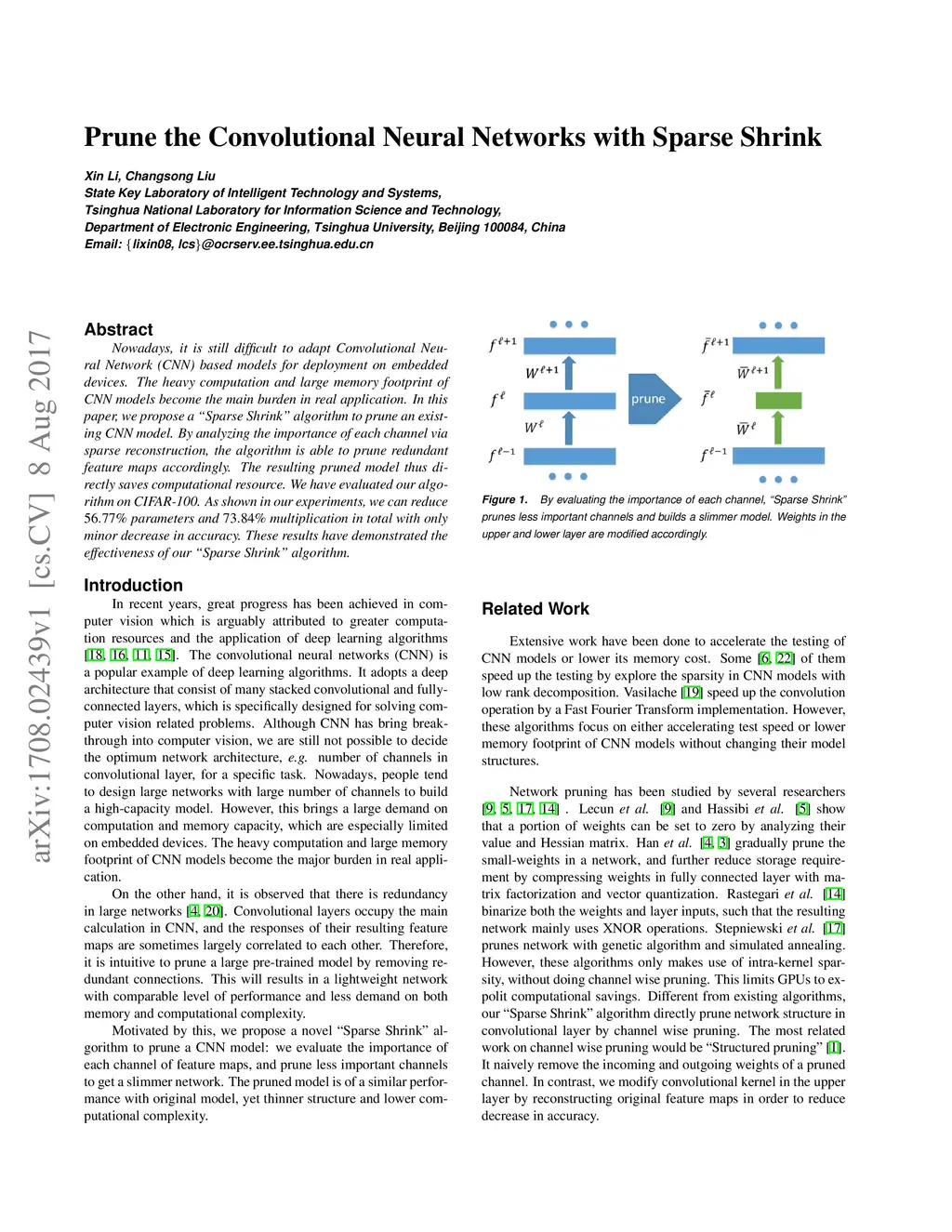 Nowadays, it is still difficult to adapt Convolutional Neural Network (CNN) based models for deployment on embedded devices. The heavy computation and large memory footprint of CNN models become the main burden in real application. In this paper, we propose a "Sparse Shrink" algorithm to prune an existing CNN model. By analyzing the importance of each channel via sparse reconstruction, the algorithm is able to prune redundant feature maps accordingly. The resulting pruned model thus directly saves computational resource. We have evaluated our algorithm on CIFAR-100. As shown in our experiments, we can reduce 56.77% parameters and 73.84% multiplication in total with only minor decrease in accuracy. These results have demonstrated the effectiveness of our "Sparse Shrink" algorithm.