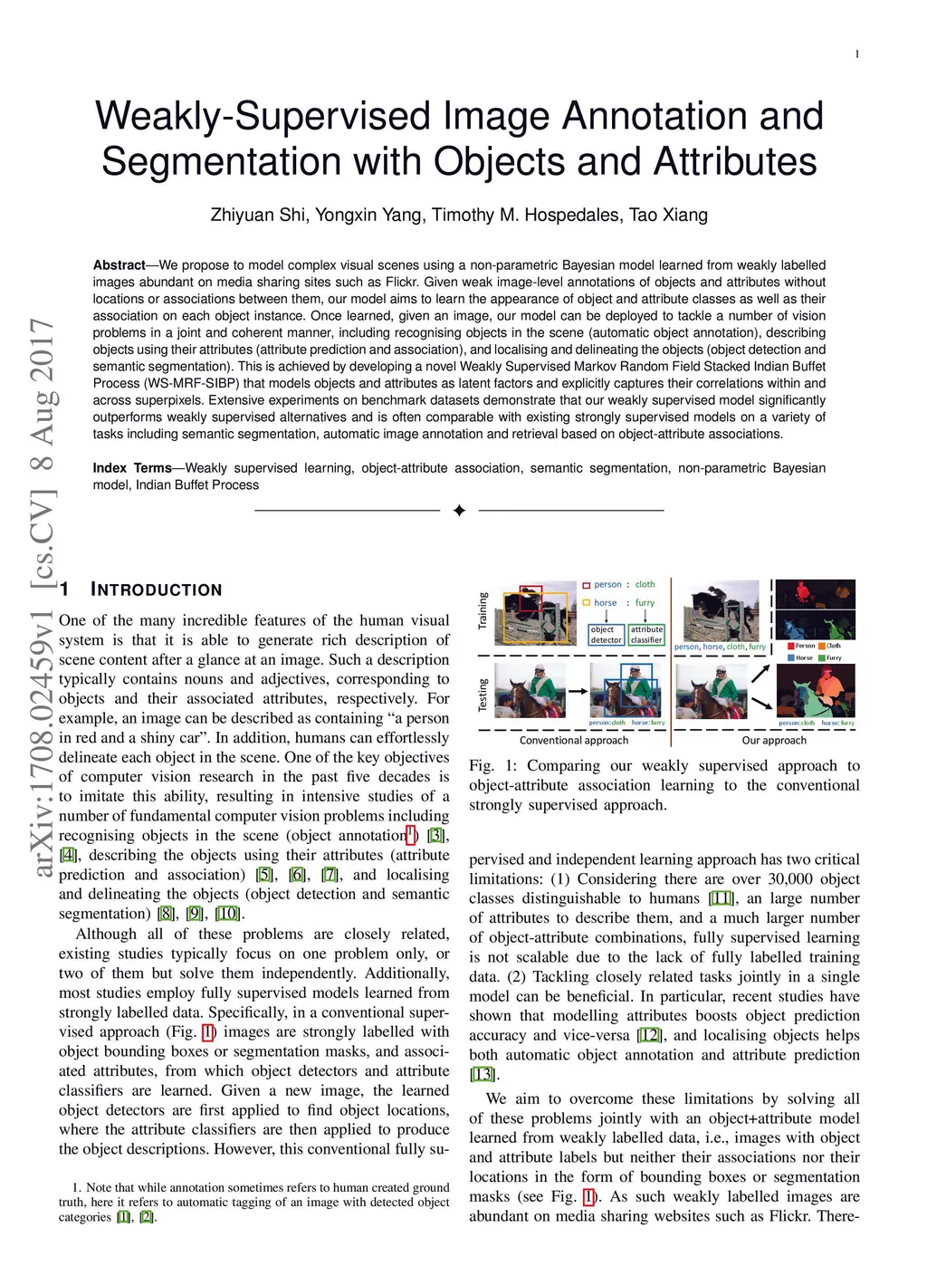 We propose to model complex visual scenes using a non-parametric Bayesian model learned from weakly labelled images abundant on media sharing sites such as Flickr. Given weak image-level annotations of objects and attributes without locations or associations between them, our model aims to learn the appearance of object and attribute classes as well as their association on each object instance. Once learned, given an image, our model can be deployed to tackle a number of vision problems in a joint and coherent manner, including recognising objects in the scene (automatic object annotation), describing objects using their attributes (attribute prediction and association), and localising and delineating the objects (object detection and semantic segmentation). This is achieved by developing a novel Weakly Supervised Markov Random Field Stacked Indian Buffet Process (WS-MRF-SIBP) that models objects and attributes as latent factors and explicitly captures their correlations within and across superpixels. Extensive experiments on benchmark datasets demonstrate that our weakly supervised model significantly outperforms weakly supervised alternatives and is often comparable with existing strongly supervised models on a variety of tasks including semantic segmentation, automatic image annotation and retrieval based on object-attribute associations.