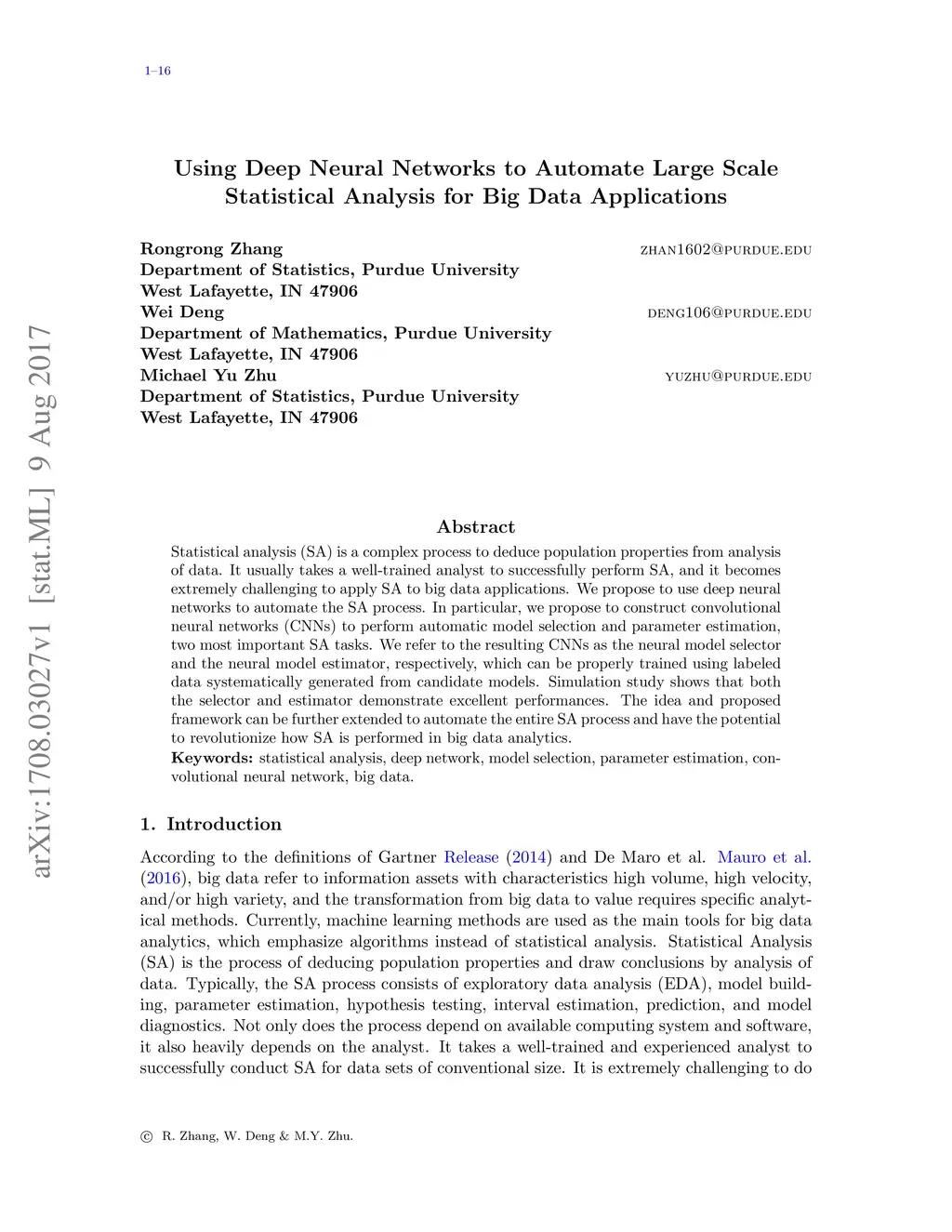 Statistical analysis (SA) is a complex process to deduce population properties from analysis of data. It usually takes a well-trained analyst to successfully perform SA, and it becomes extremely challenging to apply SA to big data applications. We propose to use deep neural networks to automate the SA process. In particular, we propose to construct convolutional neural networks (CNNs) to perform automatic model selection and parameter estimation, two most important SA tasks. We refer to the resulting CNNs as the neural model selector and the neural model estimator, respectively, which can be properly trained using labeled data systematically generated from candidate models. Simulation study shows that both the selector and estimator demonstrate excellent performances. The idea and proposed framework can be further extended to automate the entire SA process and have the potential to revolutionize how SA is performed in big data analytics.