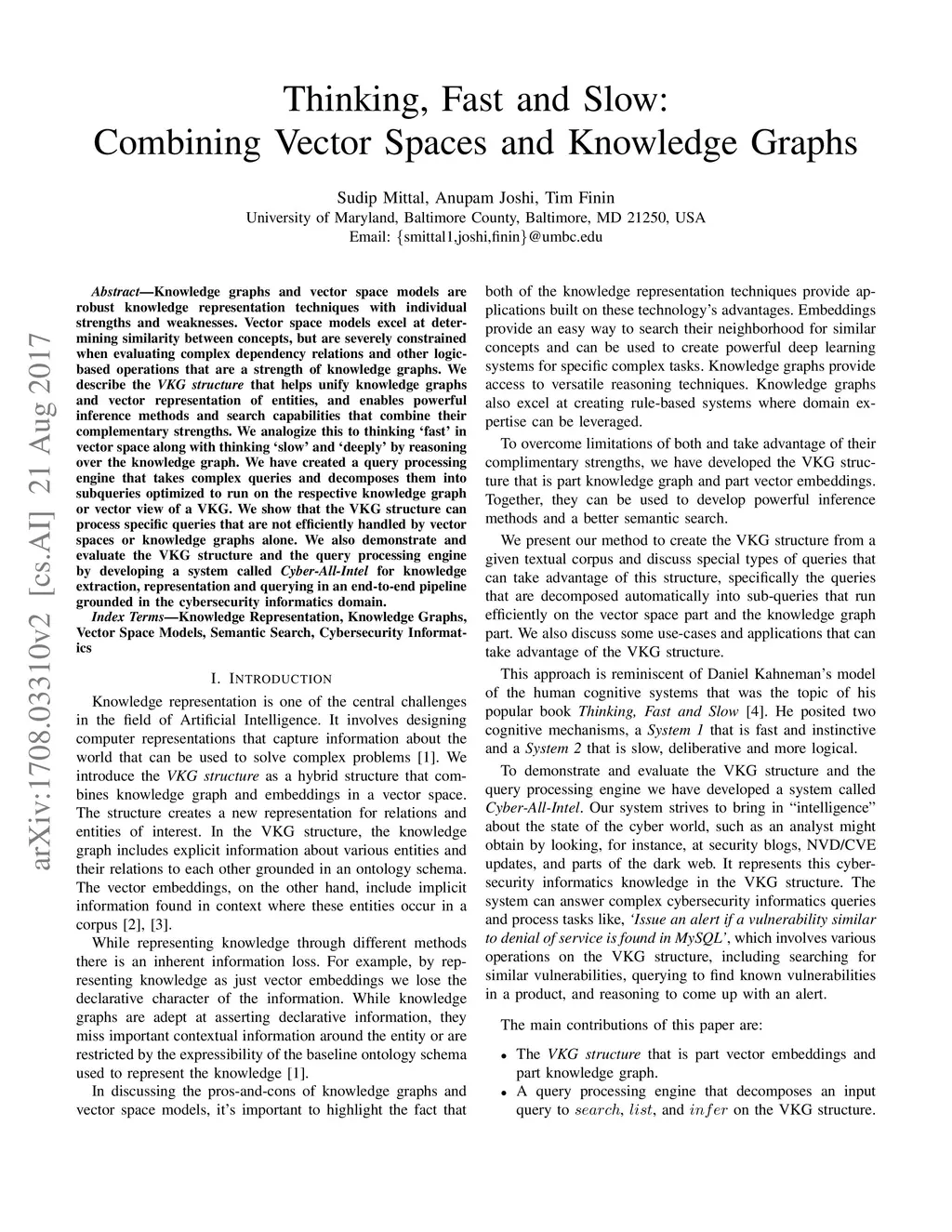 Knowledge graphs and vector space models are robust knowledge representation techniques with individual strengths and weaknesses. Vector space models excel at determining similarity between concepts, but are severely constrained when evaluating complex dependency relations and other logic-based operations that are a strength of knowledge graphs. We describe the VKG structure that helps unify knowledge graphs and vector representation of entities, and enables powerful inference methods and search capabilities that combine their complementary strengths. We analogize this to thinking `fast' in vector space along with thinking 'slow' and `deeply' by reasoning over the knowledge graph. We have created a query processing engine that takes complex queries and decomposes them into subqueries optimized to run on the respective knowledge graph or vector view of a VKG. We show that the VKG structure can process specific queries that are not efficiently handled by vector spaces or knowledge graphs alone. We also demonstrate and evaluate the VKG structure and the query processing engine by developing a system called Cyber-All-Intel for knowledge extraction, representation and querying in an end-to-end pipeline grounded in the cybersecurity informatics domain.