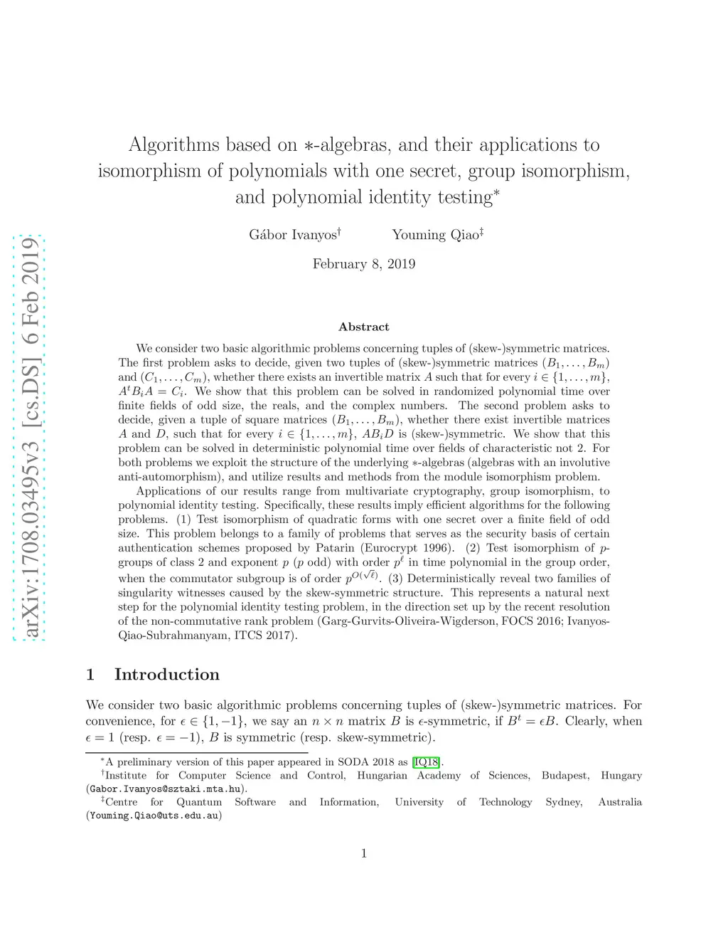 We consider two basic algorithmic problems concerning tuples of (skew-)symmetric matrices. The first problem asks to decide, given two tuples of (skew-)symmetric matrices and , whether there exists an invertible matrix such that for every , . We show that this problem can be solved in randomized polynomial time over finite fields of odd size, the real field, and the complex field. The second problem asks to decide, given a tuple of square matrices , whether there exist invertible matrices and , such that for every , is (skew-)symmetric. We show that this problem can be solved in deterministic polynomial time over fields of characteristic not . For both problems we exploit the structure of the underlying -algebras, and utilize results and methods from the module isomorphism problem. Applications of our results range from multivariate cryptography, group isomorphism, to polynomial identity testing. Specifically, these results imply efficient algorithms for the following problems. (1) Test isomorphism of quadratic forms with one secret over a finite field of odd size. This problem belongs to a family of problems that serves as the security basis of certain authentication schemes proposed by Patarin (Eurocrypto 1996). (2) Test isomorphism of -groups of class 2 and exponent ( odd) with order in time polynomial in the group order, when the commutator subgroup is of order . (3) Deterministically reveal two families of singularity witnesses caused by the skew-symmetric structure, which represents a natural next step for the polynomial identity testing problem following the direction set up by the recent resolution of the non-commutative rank problem (Garg et al., FOCS 2016; Ivanyos et al., ITCS 2017).
