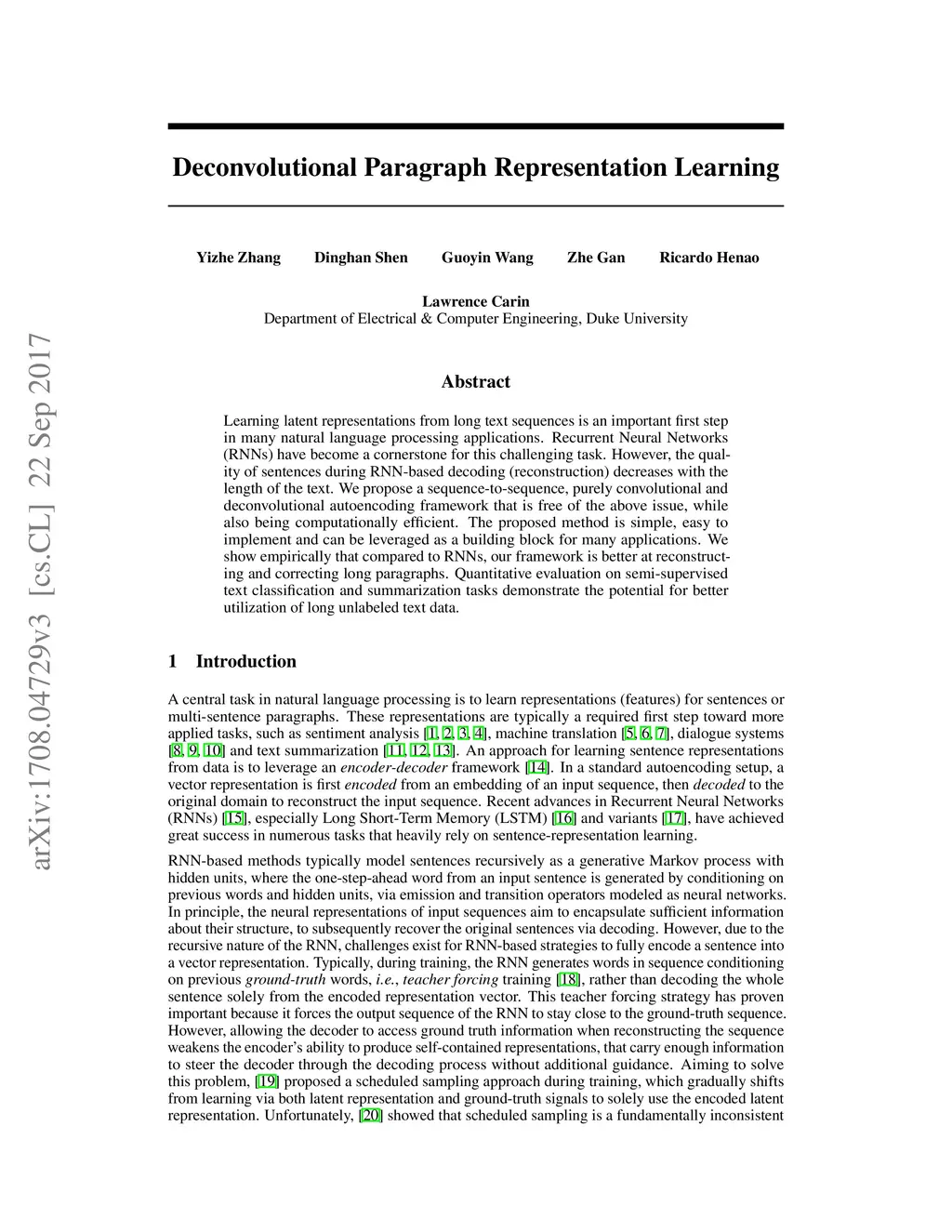 Learning latent representations from long text sequences is an important first step in many natural language processing applications. Recurrent Neural Networks (RNNs) have become a cornerstone for this challenging task. However, the quality of sentences during RNN-based decoding (reconstruction) decreases with the length of the text. We propose a sequence-to-sequence, purely convolutional and deconvolutional autoencoding framework that is free of the above issue, while also being computationally efficient. The proposed method is simple, easy to implement and can be leveraged as a building block for many applications. We show empirically that compared to RNNs, our framework is better at reconstructing and correcting long paragraphs. Quantitative evaluation on semi-supervised text classification and summarization tasks demonstrate the potential for better utilization of long unlabeled text data.