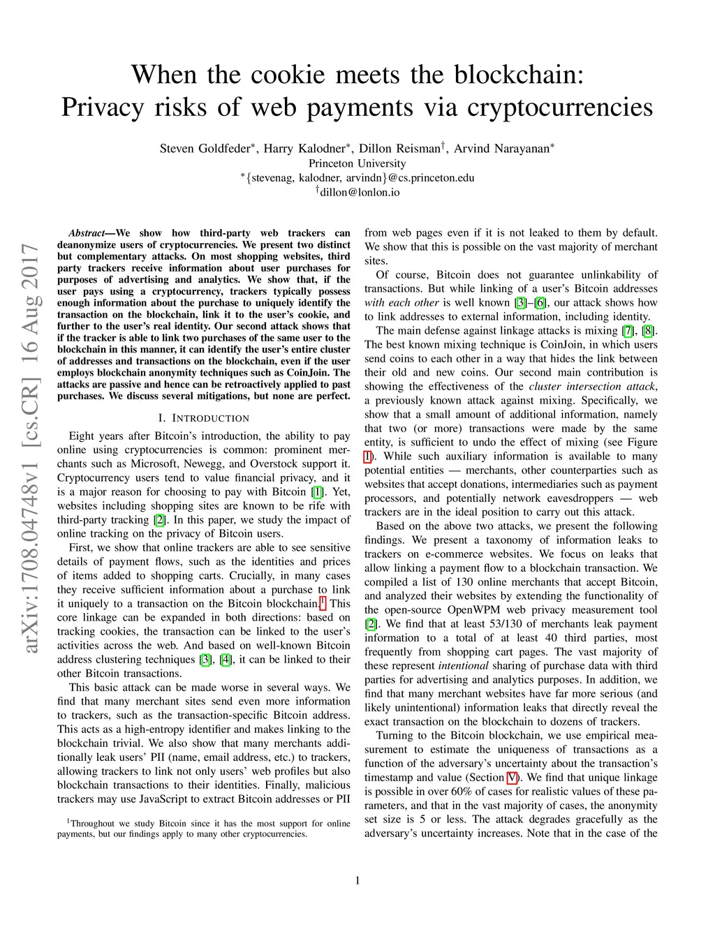 We show how third-party web trackers can deanonymize users of cryptocurrencies. We present two distinct but complementary attacks. On most shopping websites, third party trackers receive information about user purchases for purposes of advertising and analytics. We show that, if the user pays using a cryptocurrency, trackers typically possess enough information about the purchase to uniquely identify the transaction on the blockchain, link it to the user's cookie, and further to the user's real identity. Our second attack shows that if the tracker is able to link two purchases of the same user to the blockchain in this manner, it can identify the user's entire cluster of addresses and transactions on the blockchain, even if the user employs blockchain anonymity techniques such as CoinJoin. The attacks are passive and hence can be retroactively applied to past purchases. We discuss several mitigations, but none are perfect.