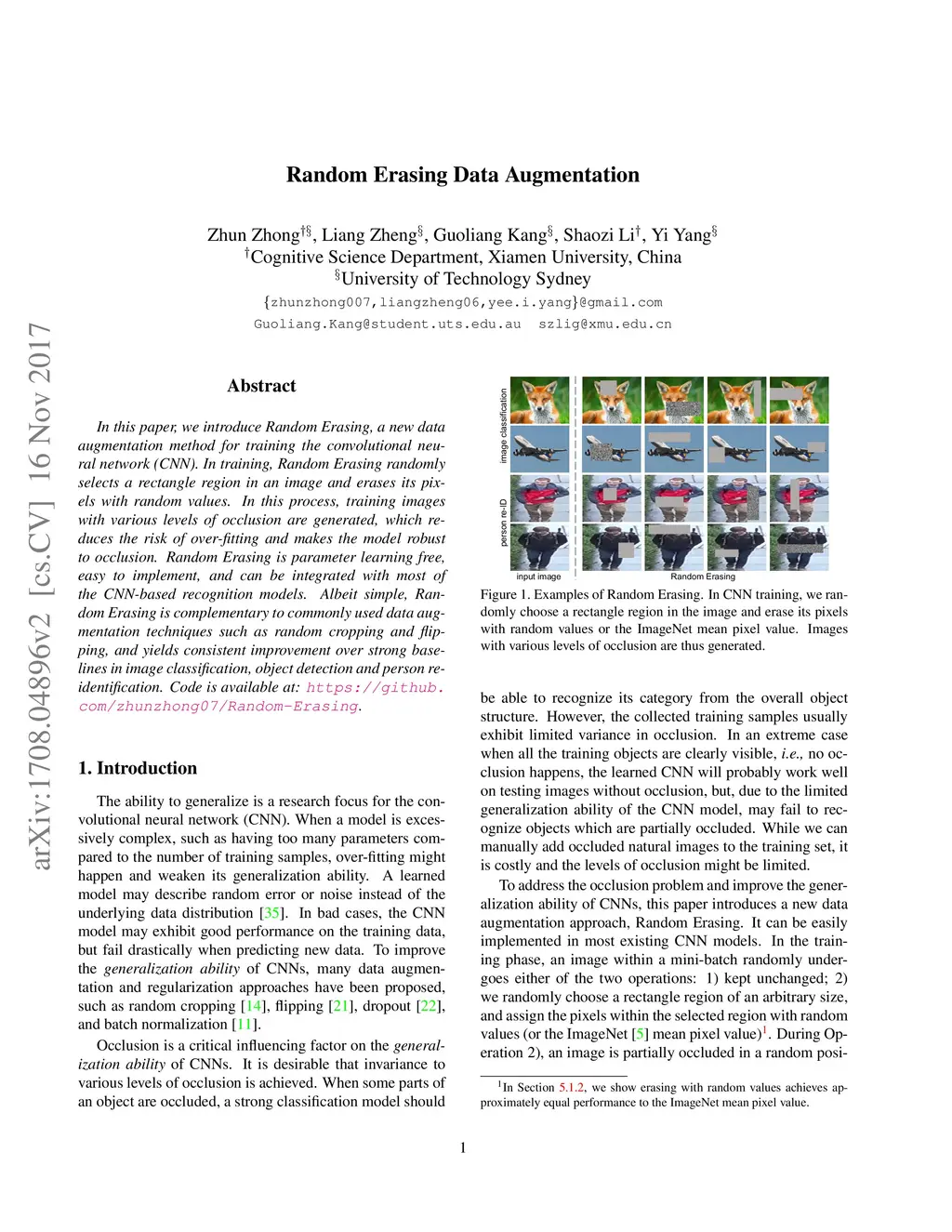 In this paper, we introduce Random Erasing, a new data augmentation method for training the convolutional neural network (CNN). In training, Random Erasing randomly selects a rectangle region in an image and erases its pixels with random values. In this process, training images with various levels of occlusion are generated, which reduces the risk of over-fitting and makes the model robust to occlusion. Random Erasing is parameter learning free, easy to implement, and can be integrated with most of the CNN-based recognition models. Albeit simple, Random Erasing is complementary to commonly used data augmentation techniques such as random cropping and flipping, and yields consistent improvement over strong baselines in image classification, object detection and person re-identification. Code is available at: https://github.com/zhunzhong07/Random-Erasing.