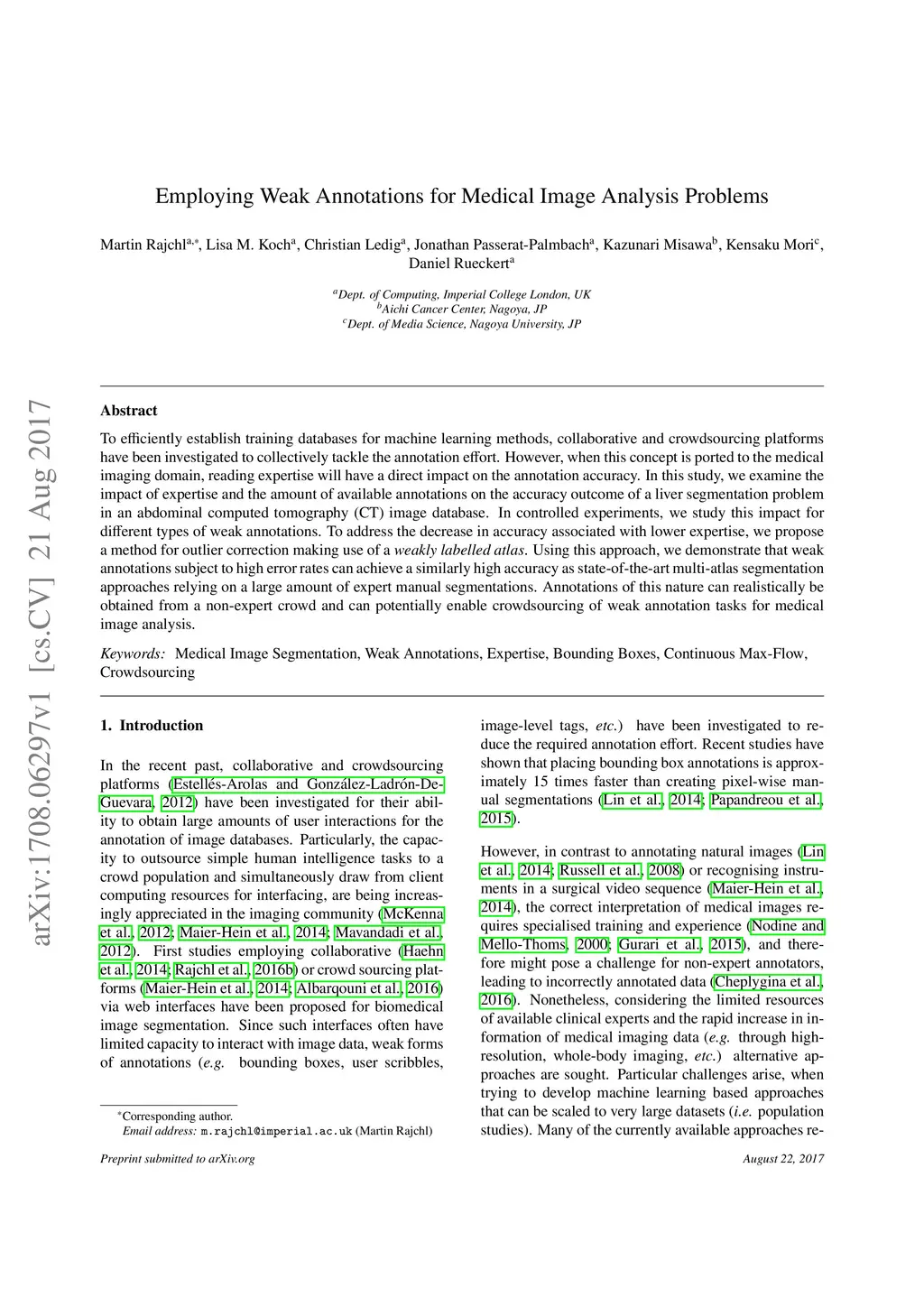 To efficiently establish training databases for machine learning methods, collaborative and crowdsourcing platforms have been investigated to collectively tackle the annotation effort. However, when this concept is ported to the medical imaging domain, reading expertise will have a direct impact on the annotation accuracy. In this study, we examine the impact of expertise and the amount of available annotations on the accuracy outcome of a liver segmentation problem in an abdominal computed tomography (CT) image database. In controlled experiments, we study this impact for different types of weak annotations. To address the decrease in accuracy associated with lower expertise, we propose a method for outlier correction making use of a weakly labelled atlas. Using this approach, we demonstrate that weak annotations subject to high error rates can achieve a similarly high accuracy as state-of-the-art multi-atlas segmentation approaches relying on a large amount of expert manual segmentations. Annotations of this nature can realistically be obtained from a non-expert crowd and can potentially enable crowdsourcing of weak annotation tasks for medical image analysis.