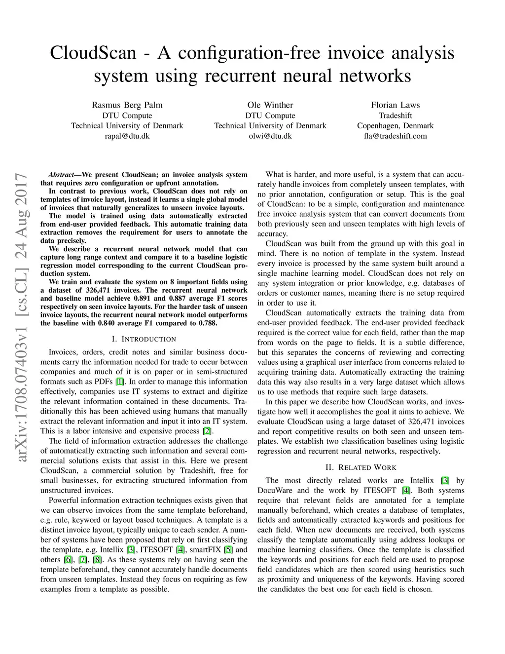 CloudScan - A configuration-free invoice analysis system using recurrent