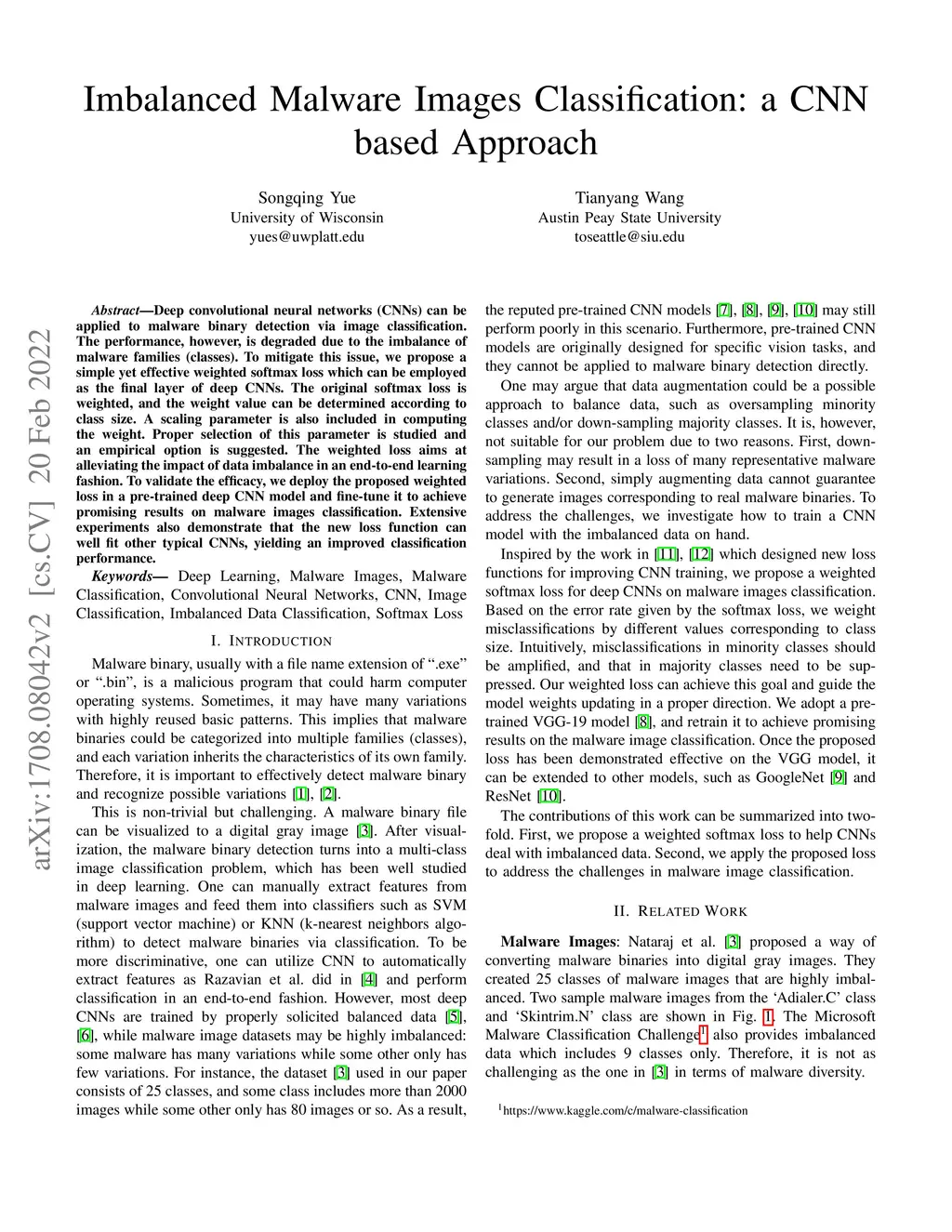 Deep convolutional neural networks (CNNs) can be applied to malware binary detection via image classification. The performance, however, is degraded due to the imbalance of malware families (classes). To mitigate this issue, we propose a simple yet effective weighted softmax loss which can be employed as the final layer of deep CNNs. The original softmax loss is weighted, and the weight value can be determined according to class size. A scaling parameter is also included in computing the weight. Proper selection of this parameter is studied and an empirical option is suggested. The weighted loss aims at alleviating the impact of data imbalance in an end-to-end learning fashion. To validate the efficacy, we deploy the proposed weighted loss in a pre-trained deep CNN model and fine-tune it to achieve promising results on malware images classification. Extensive experiments also demonstrate that the new loss function can well fit other typical CNNs, yielding an improved classification performance.