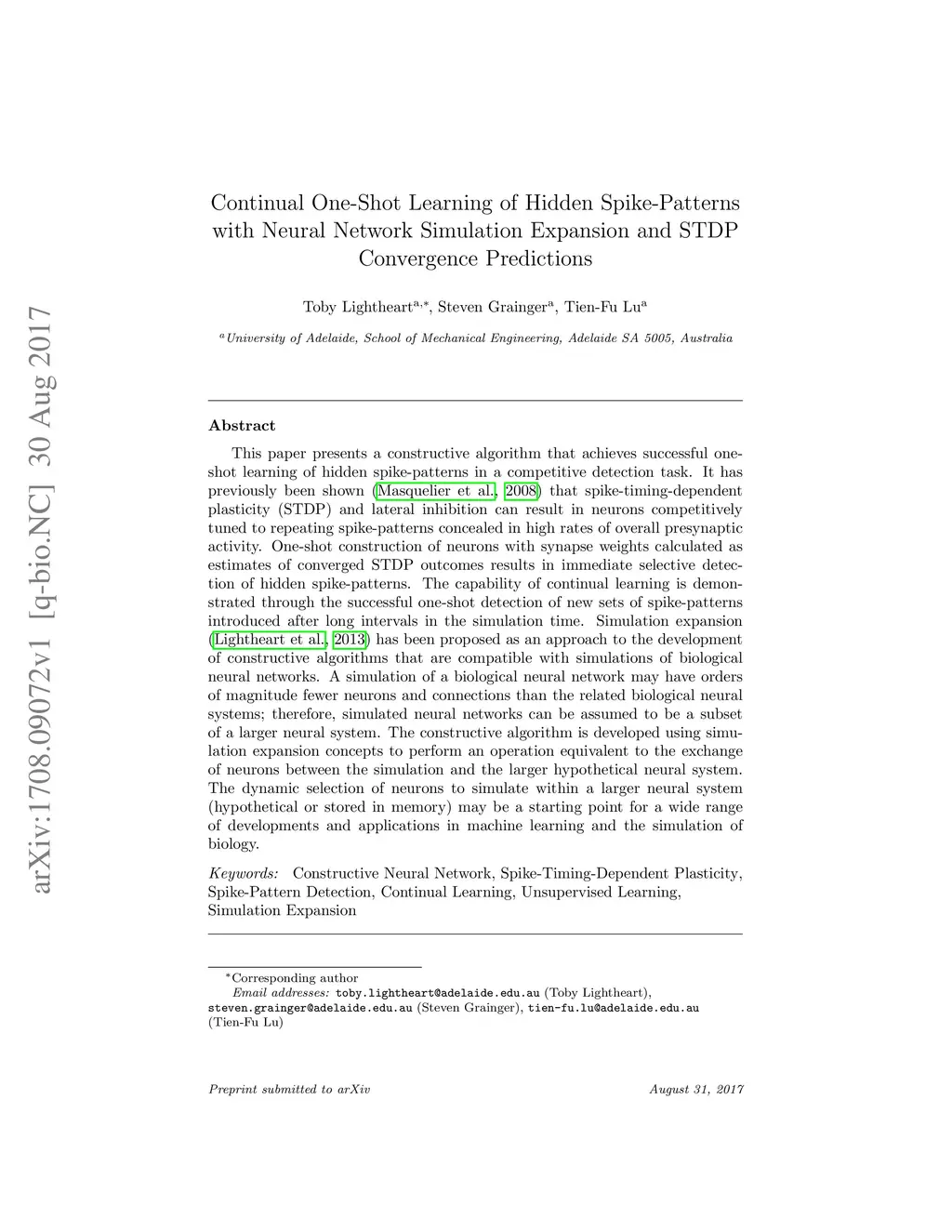 This paper presents a constructive algorithm that achieves successful one-shot learning of hidden spike-patterns in a competitive detection task. It has previously been shown (Masquelier et al., 2008) that spike-timing-dependent plasticity (STDP) and lateral inhibition can result in neurons competitively tuned to repeating spike-patterns concealed in high rates of overall presynaptic activity. One-shot construction of neurons with synapse weights calculated as estimates of converged STDP outcomes results in immediate selective detection of hidden spike-patterns. The capability of continual learning is demonstrated through the successful one-shot detection of new sets of spike-patterns introduced after long intervals in the simulation time. Simulation expansion (Lightheart et al., 2013) has been proposed as an approach to the development of constructive algorithms that are compatible with simulations of biological neural networks. A simulation of a biological neural network may have orders of magnitude fewer neurons and connections than the related biological neural systems; therefore, simulated neural networks can be assumed to be a subset of a larger neural system. The constructive algorithm is developed using simulation expansion concepts to perform an operation equivalent to the exchange of neurons between the simulation and the larger hypothetical neural system. The dynamic selection of neurons to simulate within a larger neural system (hypothetical or stored in memory) may be a starting point for a wide range of developments and applications in machine learning and the simulation of biology.