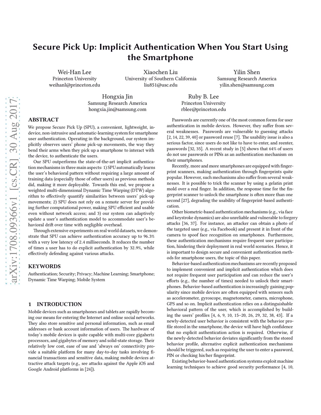 We propose Secure Pick Up (SPU), a convenient, lightweight, in-device, non-intrusive and automatic-learning system for smartphone user authentication. Operating in the background, our system implicitly observes users' phone pick-up movements, the way they bend their arms when they pick up a smartphone to interact with the device, to authenticate the users. Our SPU outperforms the state-of-the-art implicit authentication mechanisms in three main aspects: 1) SPU automatically learns the user's behavioral pattern without requiring a large amount of training data (especially those of other users) as previous methods did, making it more deployable. Towards this end, we propose a weighted multi-dimensional Dynamic Time Warping (DTW) algorithm to effectively quantify similarities between users' pick-up movements; 2) SPU does not rely on a remote server for providing further computational power, making SPU efficient and usable even without network access; and 3) our system can adaptively update a user's authentication model to accommodate user's behavioral drift over time with negligible overhead. Through extensive experiments on real world datasets, we demonstrate that SPU can achieve authentication accuracy up to 96.3% with a very low latency of 2.4 milliseconds. It reduces the number of times a user has to do explicit authentication by 32.9%, while effectively defending against various attacks.