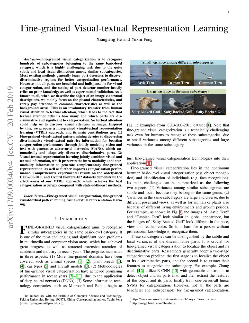 Fine-grained visual categorization is to recognize hundreds of subcategories belonging to the same basic-level category, which is a highly challenging task due to the quite subtle and local visual distinctions among similar subcategories. Most existing methods generally learn part detectors to discover discriminative regions for better categorization performance. However, not all parts are beneficial and indispensable for visual categorization, and the setting of part detector number heavily relies on prior knowledge as well as experimental validation. As is known to all, when we describe the object of an image via textual descriptions, we mainly focus on the pivotal characteristics, and rarely pay attention to common characteristics as well as the background areas. This is an involuntary transfer from human visual attention to textual attention, which leads to the fact that textual attention tells us how many and which parts are discriminative and significant to categorization. So textual attention could help us to discover visual attention in image. Inspired by this, we propose a fine-grained visual-textual representation learning (VTRL) approach, and its main contributions are: (1) Fine-grained visual-textual pattern mining devotes to discovering discriminative visual-textual pairwise information for boosting categorization performance through jointly modeling vision and text with generative adversarial networks (GANs), which automatically and adaptively discovers discriminative parts. (2) Visual-textual representation learning jointly combines visual and textual information, which preserves the intra-modality and inter-modality information to generate complementary fine-grained representation, as well as further improves categorization performance.