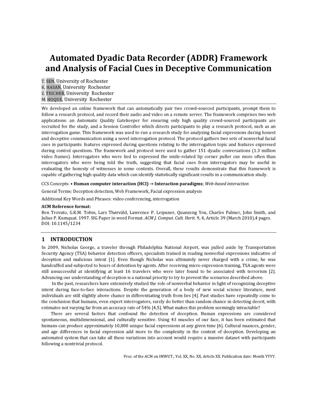 We developed an online framework that can automatically pair two crowd-sourced participants, prompt them to follow a research protocol, and record their audio and video on a remote server. The framework comprises two web applications: an Automatic Quality Gatekeeper for ensuring only high quality crowd-sourced participants are recruited for the study, and a Session Controller which directs participants to play a research protocol, such as an interrogation game. This framework was used to run a research study for analyzing facial expressions during honest and deceptive communication using a novel interrogation protocol. The protocol gathers two sets of nonverbal facial cues in participants: features expressed during questions relating to the interrogation topic and features expressed during control questions. The framework and protocol were used to gather 151 dyadic conversations (1.3 million video frames). Interrogators who were lied to expressed the smile-related lip corner puller cue more often than interrogators who were being told the truth, suggesting that facial cues from interrogators may be useful in evaluating the honesty of witnesses in some contexts. Overall, these results demonstrate that this framework is capable of gathering high quality data which can identify statistically significant results in a communication study.