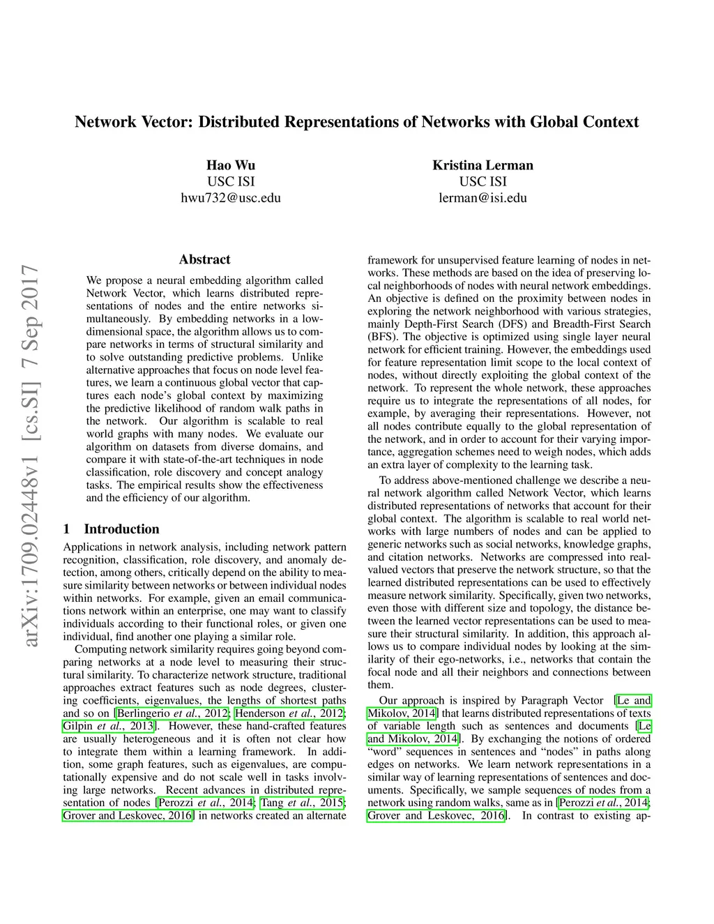 We propose a neural embedding algorithm called Network Vector, which learns distributed representations of nodes and the entire networks simultaneously. By embedding networks in a low-dimensional space, the algorithm allows us to compare networks in terms of structural similarity and to solve outstanding predictive problems. Unlike alternative approaches that focus on node level features, we learn a continuous global vector that captures each node's global context by maximizing the predictive likelihood of random walk paths in the network. Our algorithm is scalable to real world graphs with many nodes. We evaluate our algorithm on datasets from diverse domains, and compare it with state-of-the-art techniques in node classification, role discovery and concept analogy tasks. The empirical results show the effectiveness and the efficiency of our algorithm.