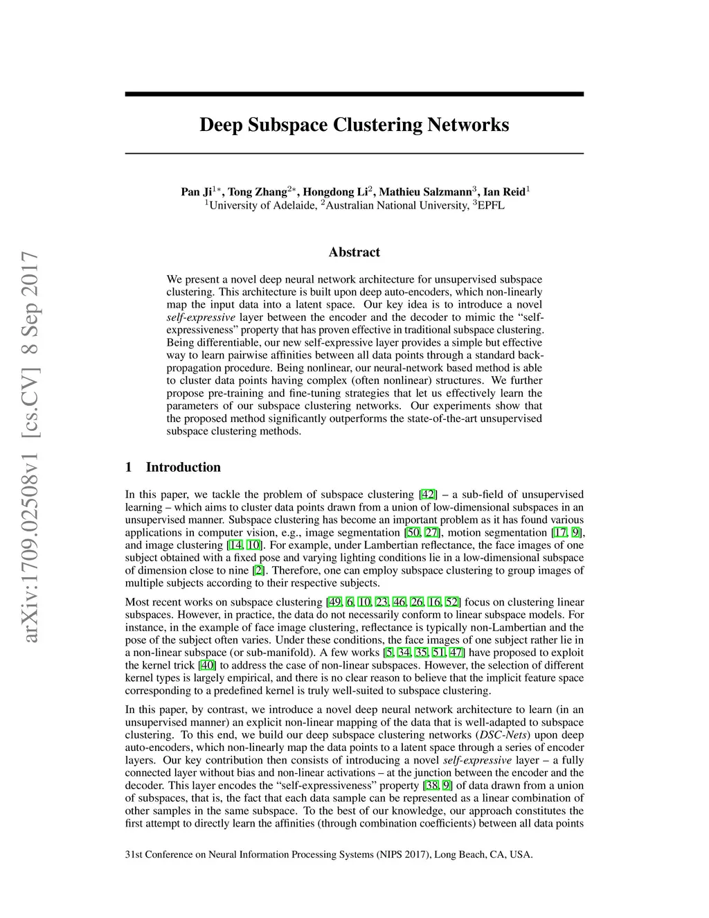 We present a novel deep neural network architecture for unsupervised subspace clustering. This architecture is built upon deep auto-encoders, which non-linearly map the input data into a latent space. Our key idea is to introduce a novel self-expressive layer between the encoder and the decoder to mimic the "self-expressiveness" property that has proven effective in traditional subspace clustering. Being differentiable, our new self-expressive layer provides a simple but effective way to learn pairwise affinities between all data points through a standard back-propagation procedure. Being nonlinear, our neural-network based method is able to cluster data points having complex (often nonlinear) structures. We further propose pre-training and fine-tuning strategies that let us effectively learn the parameters of our subspace clustering networks. Our experiments show that the proposed method significantly outperforms the state-of-the-art unsupervised subspace clustering methods.